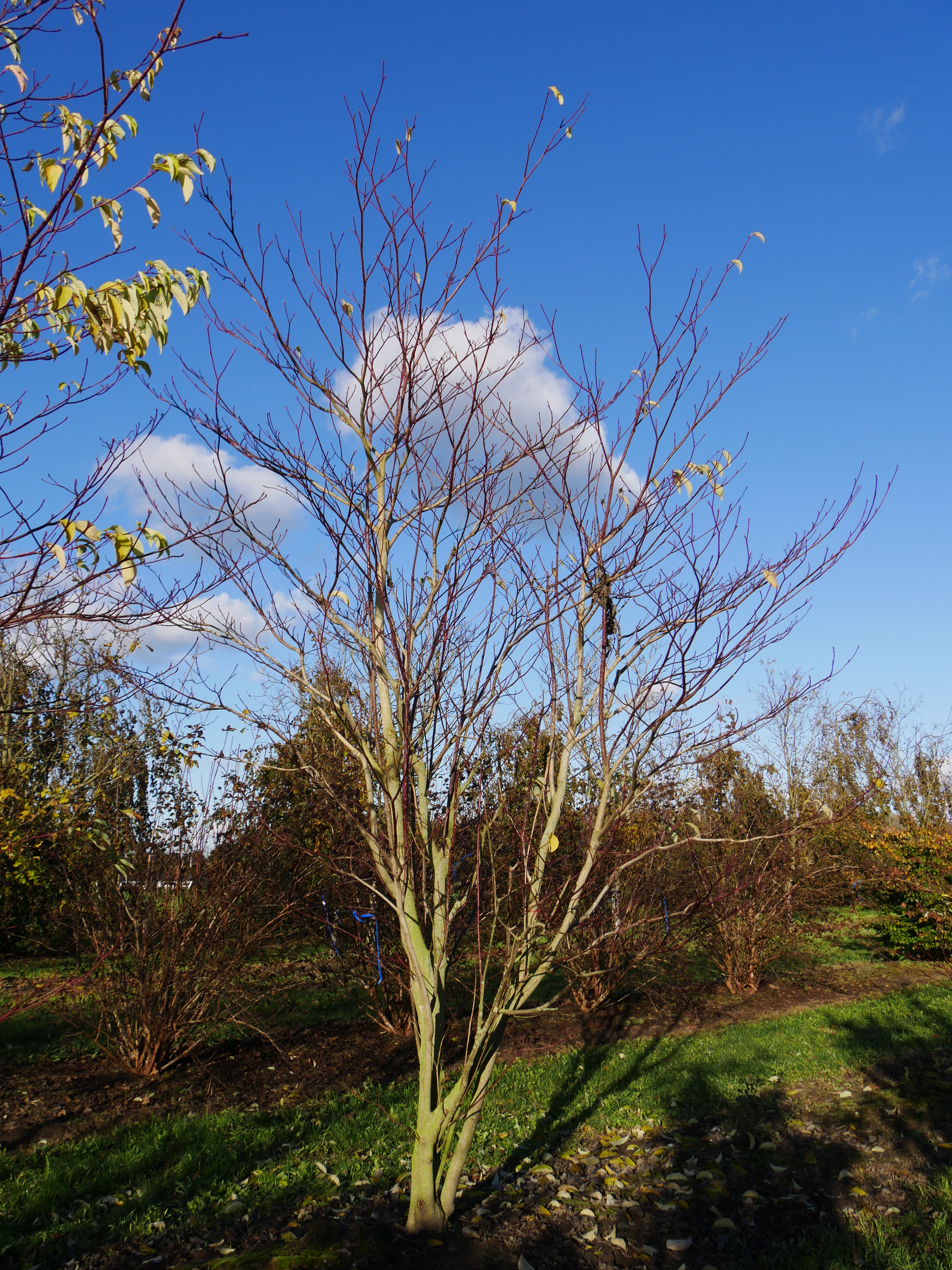 Small tree with branches rising in successive horizontal layers. ‘Pagoda’ was specially selected for its good, regular habit. The crown eventually becomes as broad as it is tall. The young twigs turn from reddish brown to greenish brown. The leaf is irregular in shape and glossy dark green. In autumn it turns purplish red. Because the leaves curl up a little in autumn, their conspicuously light undersides become clearly visible. The large, umbel-shaped flower corymbs can be followed by small, dark blue berries. However, the fruit yield is very variable and certainly not guaranteed. Shallow rooting with a fine root system. Lends itself well to pruning to create an arbour. Because the sap starts flowing early in the year, pruning should be done in summer or autumn.