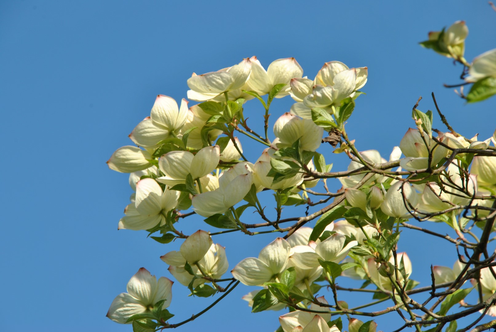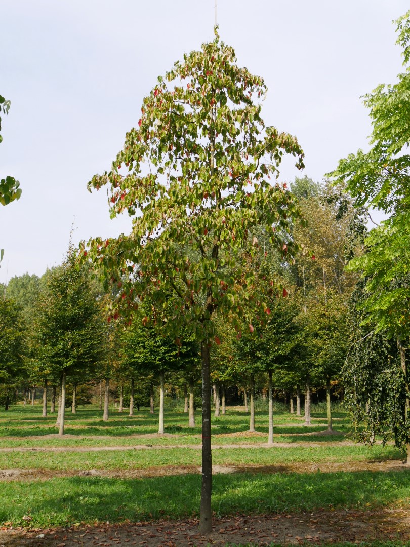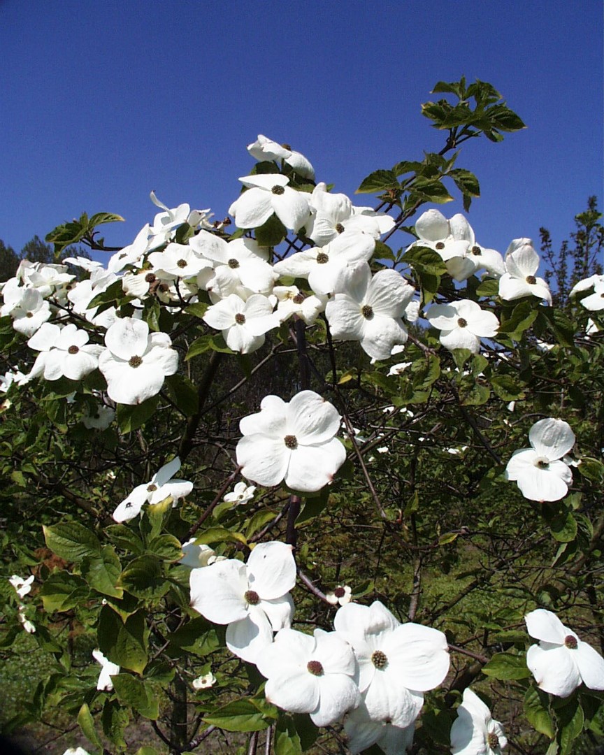 Small tree up to about 10 m, grows vigorously when young. The tree is fairly slender initially, but older branches start to project more and eventually hang gracefully. This produces a broad, pyramidal crown. The large glossy, dark green leaves give beautiful deep red to purplish red autumn colours. Each flower head is surrounded by four to six bracts. These are white and project nearly horizontally from the flower stalk. The flower panicle has a diameter of 10 to 15 cm. ‘Eddie’s White Wonder’ is a hybrid of C. florida and C. nuttallii, and most resembles C. nuttallii. However, the tree is sterile, blossoms two or three weeks later, and is hardier.