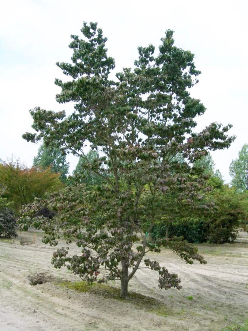 Starting from a shrub and growing into a small tree with multiple stems and a spherical crown. When maturing the branches may hang down a little, making the crown as wide as it is high. The tree grows slowly. Twigs turn from red brown into grey. Mature stems get grey spots due to flaking. The young leaf is slightly purple coloured but later it turns dark green. It has a grey-white underside. The autumn colour is a beautiful scarlet red to violet. Each head with inconspicuous little flowers has 4 bracts that are large and pink-red. This makes the inflorescence in full bloom very decorative. Because C. florida f. rubra grows in the wild, there may be variations in colour of the flowers. The colour varies from light pink to pink red. The plant is shallow rooting with a fibrous root system and requires a rich soil with a high humus content, that is not too dry.