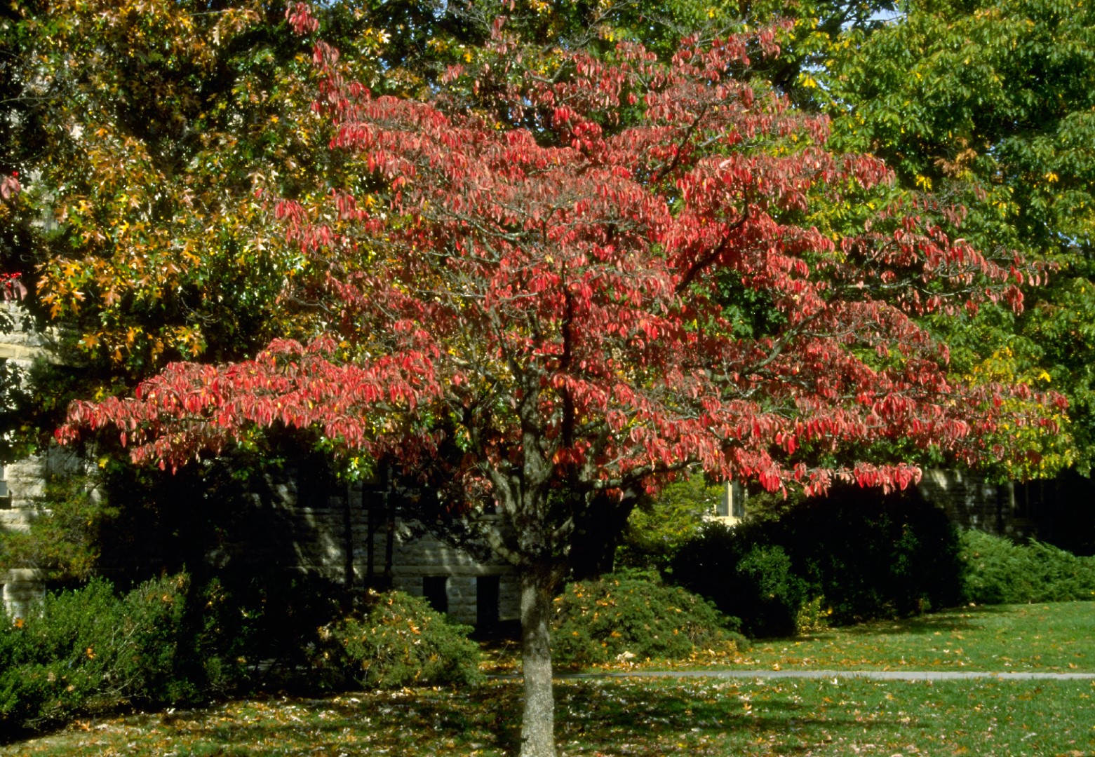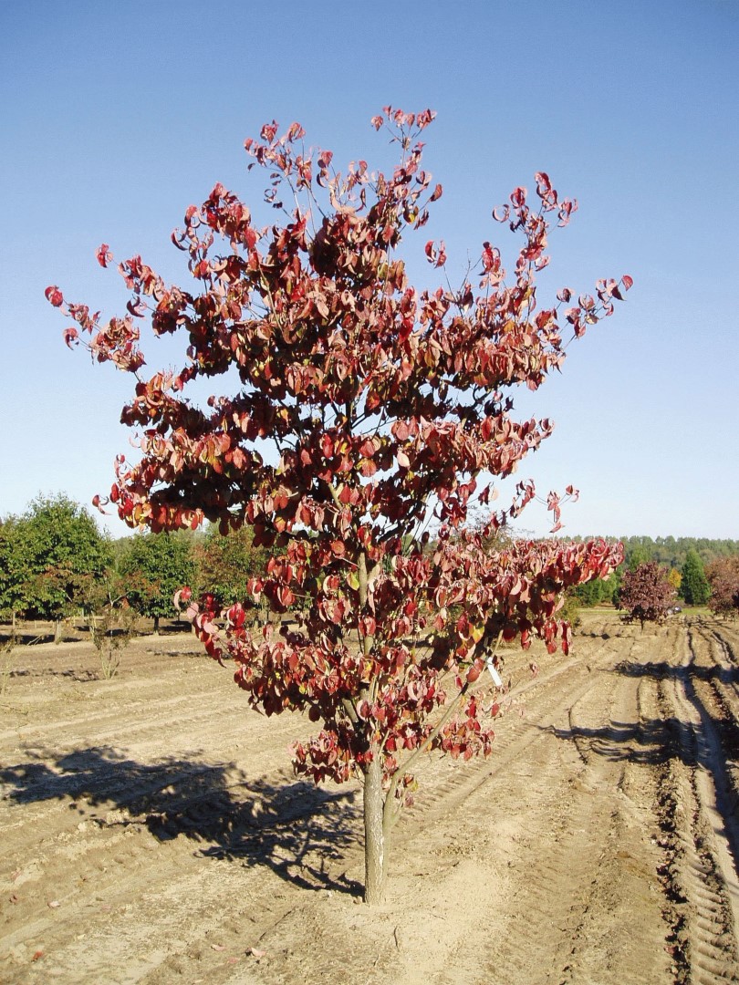 Starting from a shrub and growing into a small tree with multiple stems and a spherical crown. When maturing the branches may hang down a little, making the crown as wide as it is high. The tree grows slowly. Twigs turn from red brown into grey. Mature trunks get grey spots due to flaking. The leaf is dark green and the underside is grey. In autumn it colours beautifully from scarlet red to violet. Each head with inconspicuous little flowers is surrounded by 4 bracts that are large and have a white to slightly pinkish-red hue. This makes the inflorescence in full bloom very decorative. The ovate fruits are circa 1.5 cm across and are red coloured. The plant is shallow rooting with a fibrous root system and requires a rich soil with a high humus content, that is not too dry.