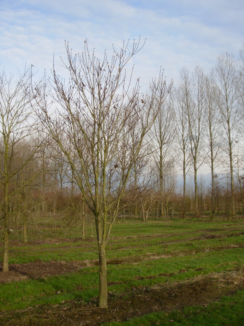 This cultivar 'Monarch' has an upright habit with a good upright central leader. Therefore it is better suited as a tree, which distinguishes it from the species. Young twigs are green but turn to brown red quickly. Mature trunks too, are red brown to grey. The green leaf turns yellow to orange red in autumn. The flowers are not showy. However, each head with flowers is surrounded by 6 (sometimes 4 or 8) ovoid, pointed bracts. These turn from cream white to entirely white, sometimes with a pink hue and can become 10 cm. This makes the plant in full bloom very decorative. 'Monarch' flowers profusely. The circa 1 cm large, orange-red fruits appear in early autumn. The plant roots shallowly with a fibrous root system. Must be protected against cold east wind.