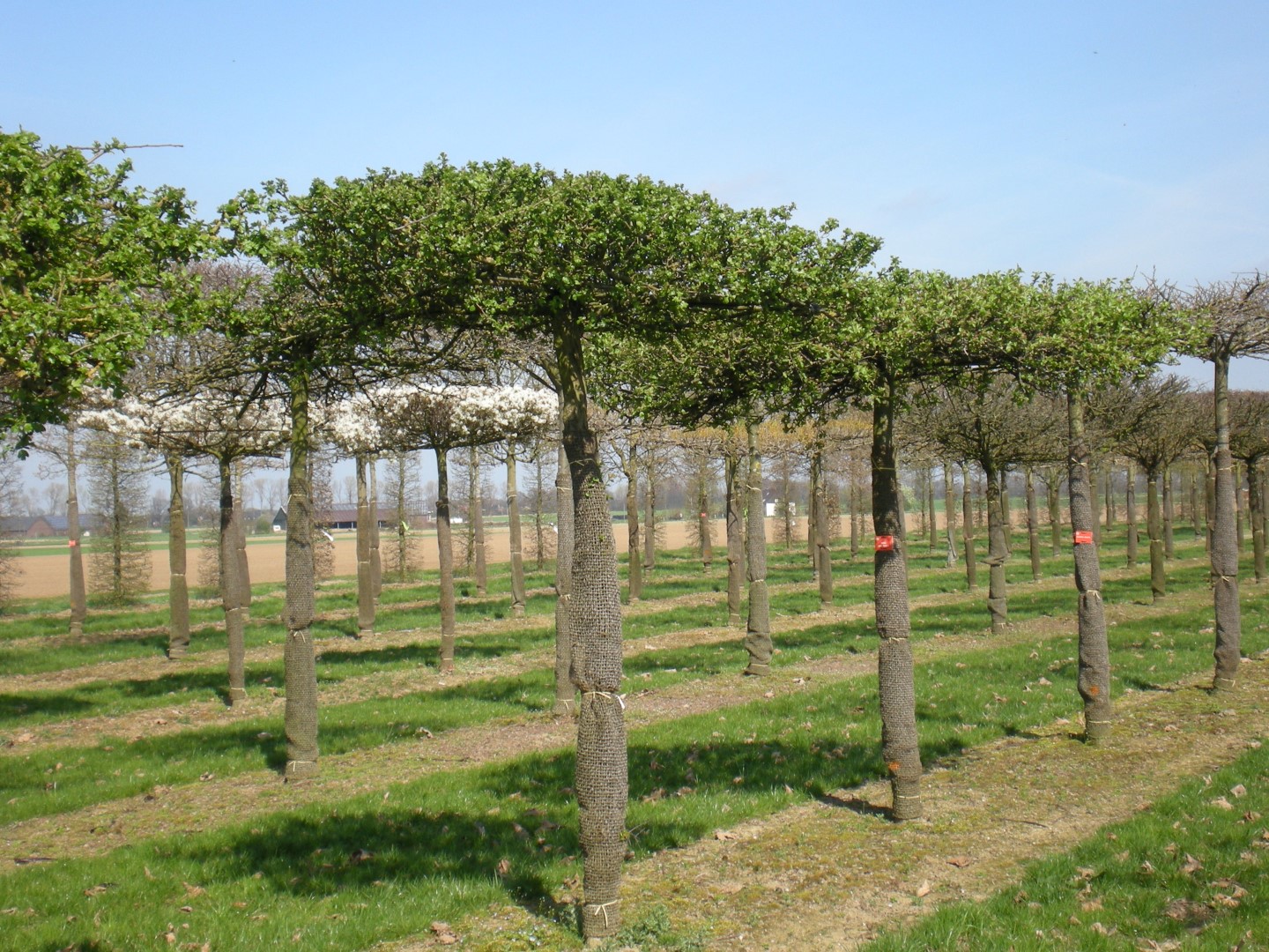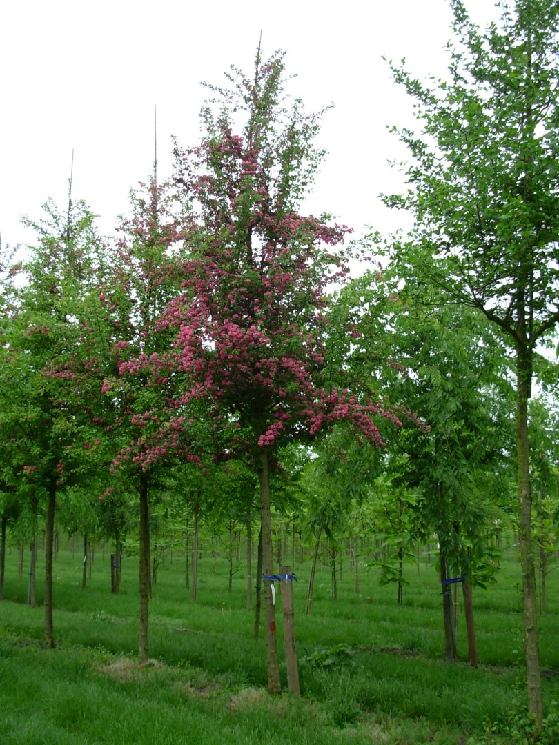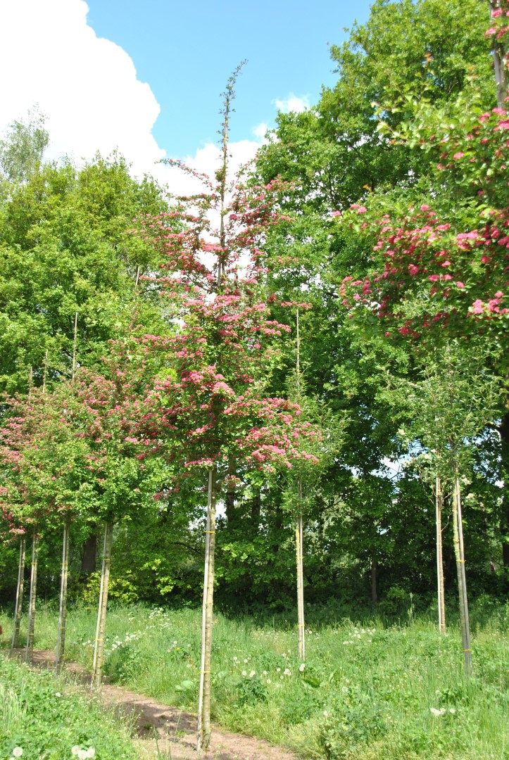 Sometimes grown as a shrub but mostly sold as a tree. The sturdy lateral branches that grow outwards create a more or less rounded open type of crown. It can eventually attain a maximum width of 6 to 7 m. The trunk and branches are grey. The branches are less thorny than those of the species. The thorns are approx. 2.5 cm long and viciously sharp. The dark green leaves are lighter on the underside. The entire tree is covered with blossom in the spring. The flowers turn from even to pale red. The tough hard roots go deep and spread wide. The soil must be sufficiently compact since the tree is sensitive to wind when the root system is not well developed. The tree is insensitive to atmospheric pollution. A much-loved tree in smaller gardens. Stands up to hard surfaces