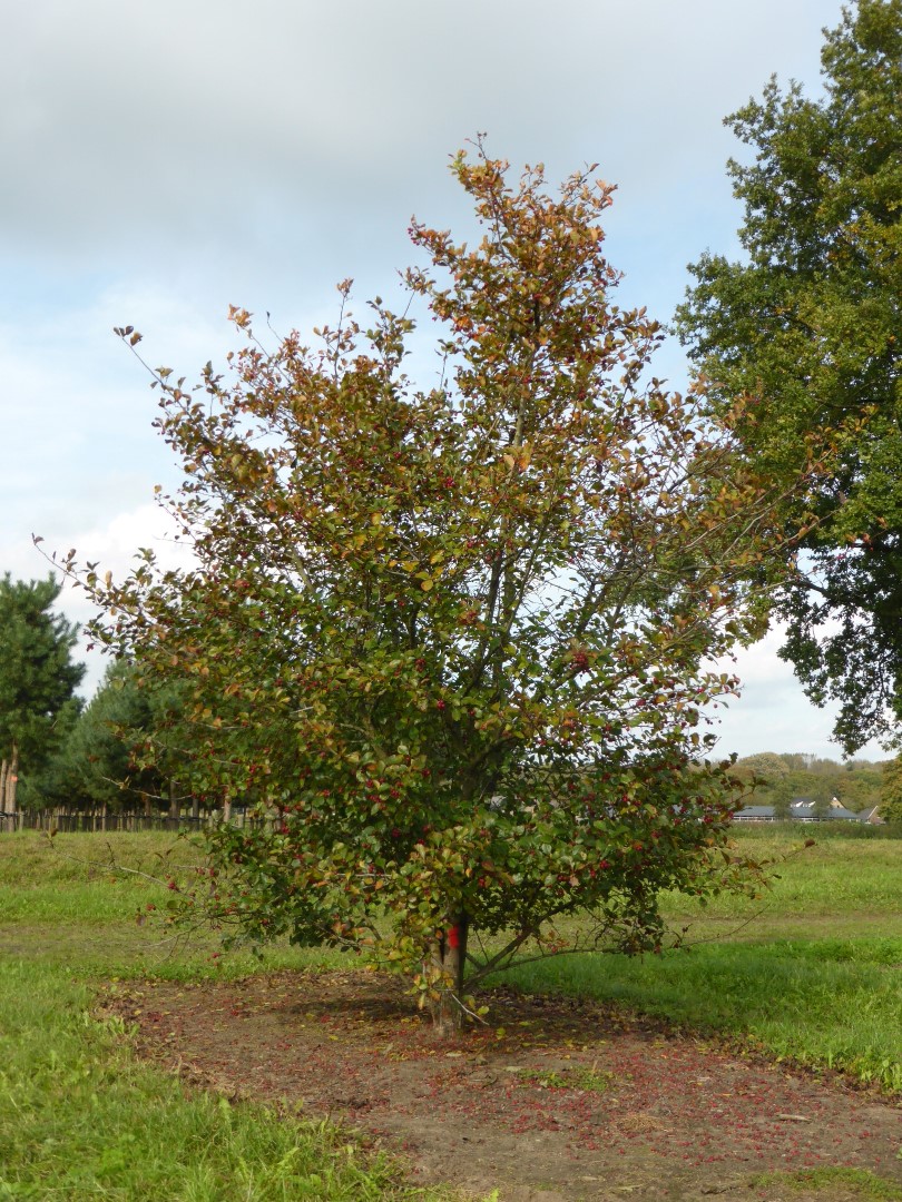 This cultivar grows more regularly and higher than the species. Height approx. 8 m, with a broad flattened crown. The branches bear many thorns. These are approx. 4 cm long. The leaves are broad oval and glossy dark green with a sharply serrated edge. The autumn colour is remarkable: red, orange and yellow tints. The white flowers appear in felt-like umbels in May and June. They are followed by bright red fruits, with a diameter of approx. 1 cm, that remain on the tree for a long time. For parks, avenues and small gardens. Winter hardiness zone: 5a