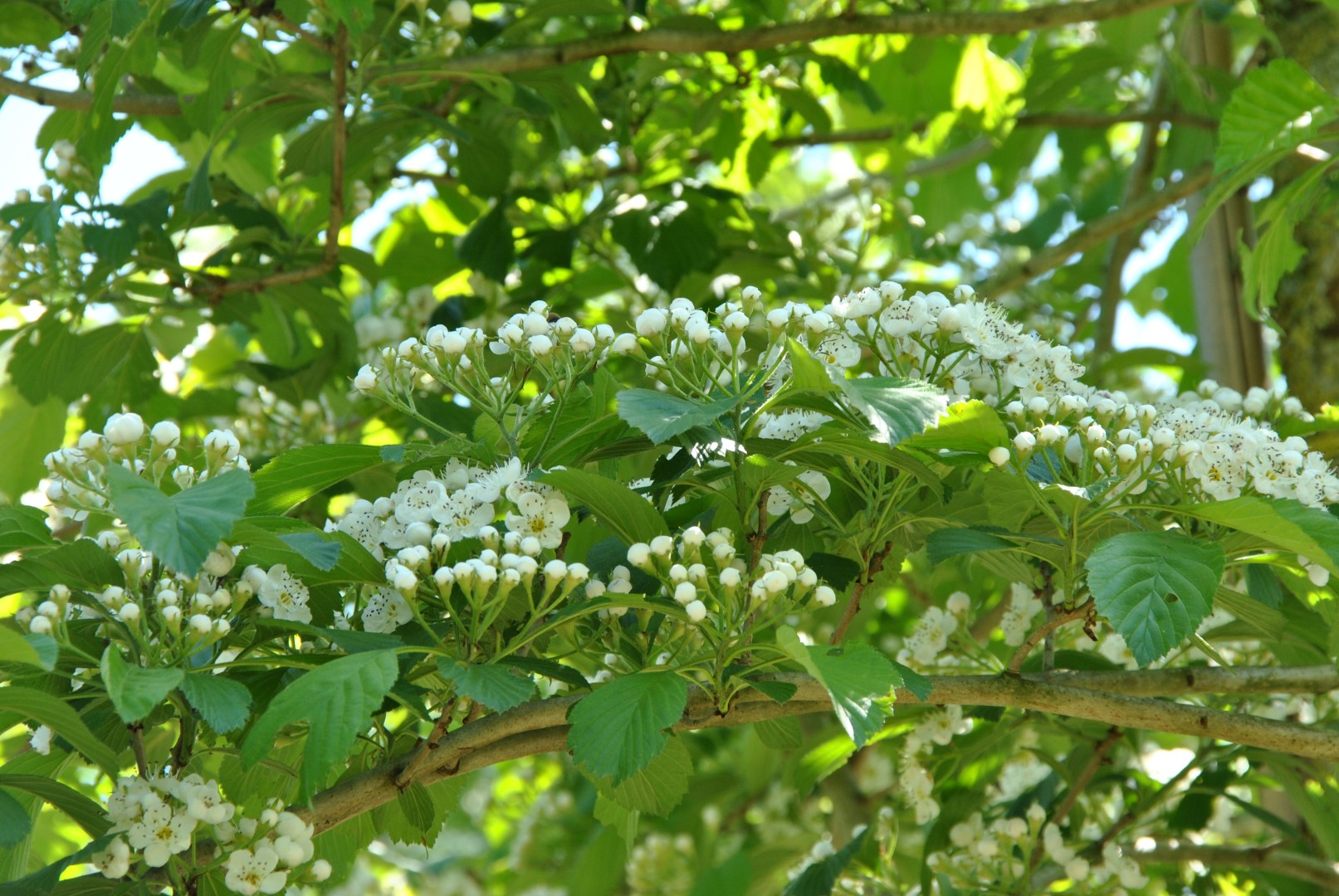American selection that grows to a height of approx. 7 - 9 m. The crown starts off round and is later flattened spherical. Dark green, broad ovoid leaves with an irregularly serrated edge emerge from the practically thornless twigs. The underside of the leaves is covered with felt-like hair. The whitish-pink flowers appear in umbels in May and June. These are followed by round dark red fruits. Winter hardiness zone: 5a