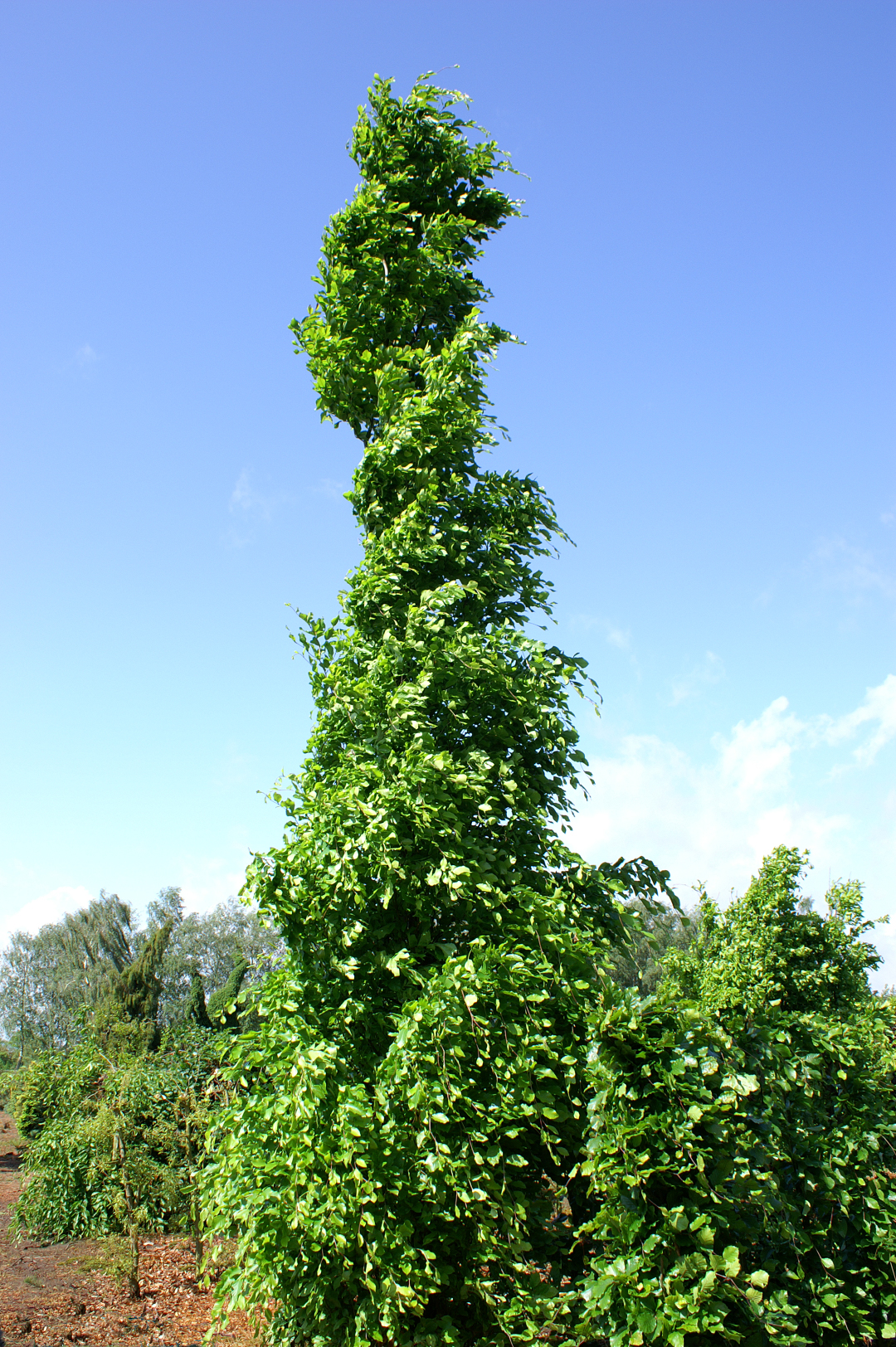 Slender, columnar tree with a vertical branch pattern and equally erect twigs. The branch structure is sturdier than with F. sylvatica and cultivars. Very predictable in shape and can attain a height of over 20 m, with a width of only a few metres. The oval to obovate leaf is 6 - 12 cm in size and glossy dark green. It remains glossy and healthy even in the second half of summer. Blossom is inconspicuous: the tree will only start to bear more fruit when mature. Prefers well-drained, humic soil that is not too wet. Thrives better in warm, dryer conditions than F. sylvatica cultivars.