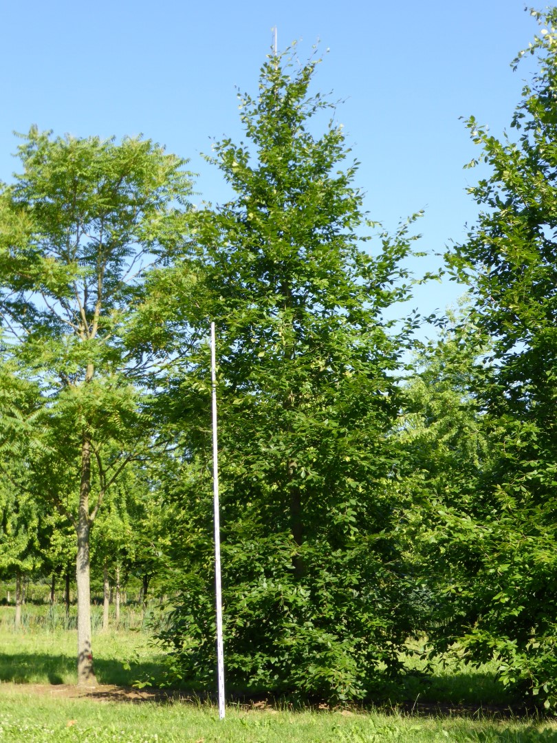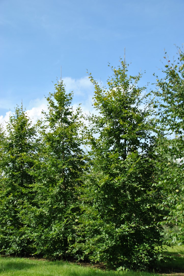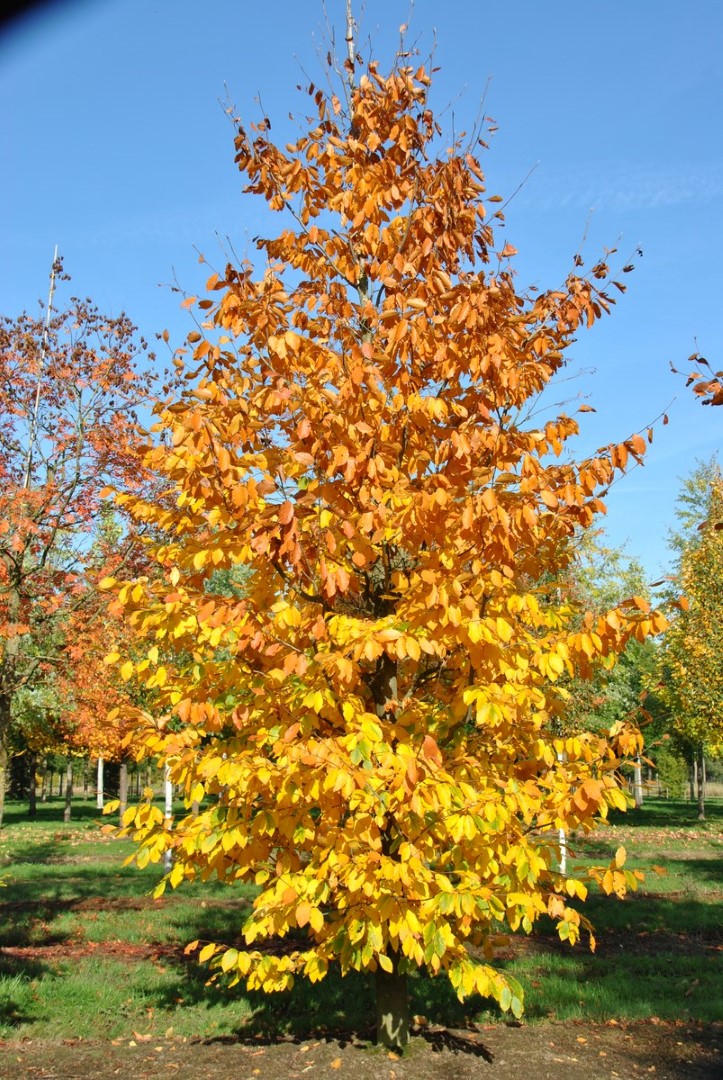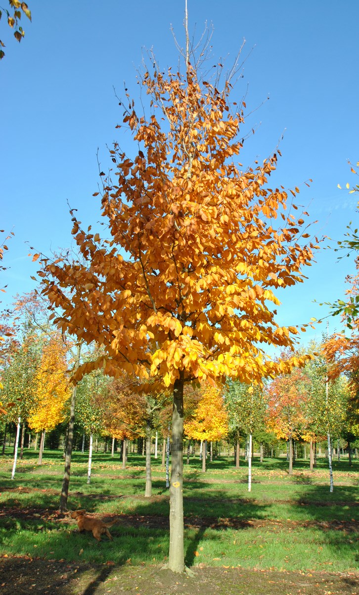 A tree that, especially as a sapling, grows more rapidly than F. sylvatica. The shape of the crown is therefore more upright than with F. sylvatica, with a more pointed top and straight upright trunk. The upright pointed branches are more diagonally placed than F. sylvatica, which makes the crown denser. The soft bark is rather thin and greyish in colour. Young twigs and leaves are thickly haired. The reverse ovate to oval (almost diamond shaped) leaves are fresh green, 6 - 12 cm large and have a yellow autumn colour. Inconspicuous flowering in small catkins, followed by 1 - 2 cm large nuts in a brush-like woody covering. The tree is best used as a park tree. Prefers well-drained, not too wet, humus rich soil and is moderately wind-tolerant.