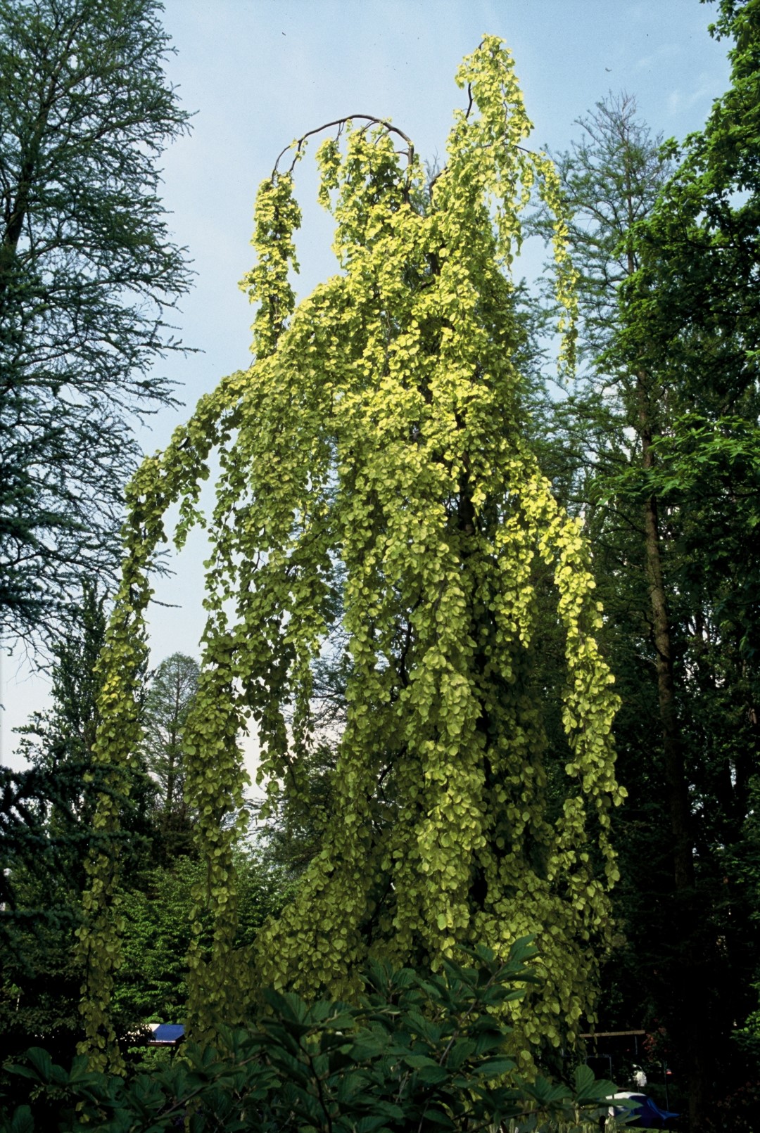 Big, graceful tree with undulately rising central leaderes, from which the lateral branches hang straight down. The lateral branches eventually reach the ground. Growth pattern same as ‘Pendula’ but remaining more slender. The oval to ovate leaves are initially somewhat larger than typical of the species. They emerge a beautiful golden yellow, turning more yellow-green in summer. The leaf is somewhat susceptible to sunburn. In autumn they turn brownish yellow. The blossom and fruits are the same as other F. sylvatica: inconspicuous flower catkins followed by 1 - 2 cm nuts in cupules covered with brush-like spines. ‘Aurea Pendula’ is a decorative tree with beautifully coloured foliage. It prospers in well-drained, humic soil that is not too wet. Moderately wind resistant.