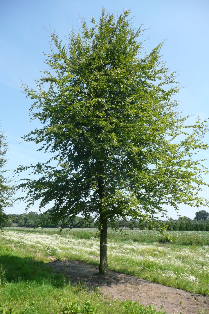 Fagus sylvatica is an impressive tree that grows in the wild in large parts of Europe. Mature specimens reach circa 35 m in height and width. The soft bark is smooth and has a grey colour. Old bark can be damaged by scorching. The shiny, dark green leaves are 4 - 10 cm large and have a curving margin.The young leaf is slightly haired when unfolding. Yellow-brown autumn colour. The tree flowers with small, inconspicuous catkins. In autumn nuts appear, only at a later age the tree does the tree bear a rich crop. Has many roots in the top soil, so that undergrowth gets little chance. The tree is used as a park tree and as a solitary. In addition it is much used for planting hedges and woodlands. Prefers humus rich soil that is not too wet and well-drained. Withstands hard surfaces less well. Moderately wind-tolerant.