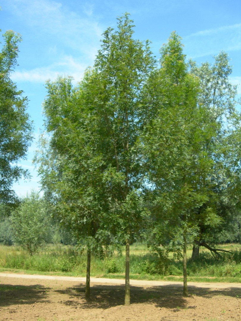 Fraxinus angustifolia (syn. F. oxycarpa) has a wide ovoid crown. Height 15 - 20 m. Important difference with F. excelsior are the much thinner twigs. Mature bark clearly furrowed. The narrow, shiny green leaf is odd-pinnate with 2 - 6 leaf pairs and a length of 15 - 25 cm. Autumn colour is yellow to wine red. Inflorescence in bunches, dioecious flowers, before the leaves appear. Forms a 2 - 6 cm large, winged nut. For park, wide avenues and streets. Wind resistant. Winter hardiness zone: 6b
