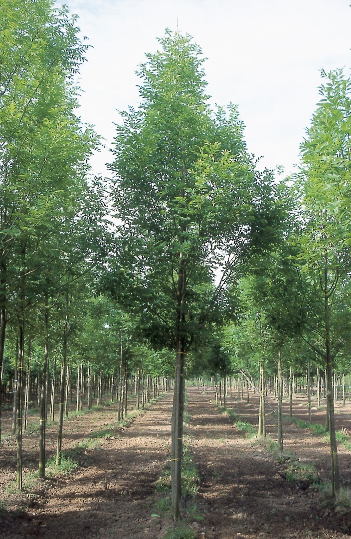 Fraxinus excelsior 'Grift' has a trunk that is straight as an arrow with a nice upright main branch and the habit is similar to that of 'Eureka'. Has a wide pyramidal to conical crown with a height of circa 20 m. The mat, odd-pinnate leaf has a lighter colour than of the 'Westhof's Glorie' and has 3 - 4 pairs and a relatively large tip leaf. Generates only few fruits. 'Grift' is a healthy cultivar that can be applied in road and street planting. It prefers nutritive, moist soil. Winter hardiness zone: 4