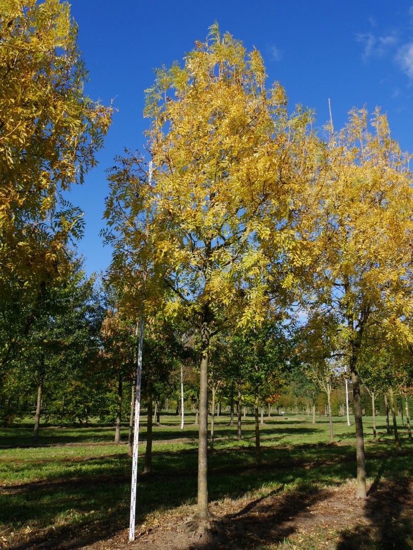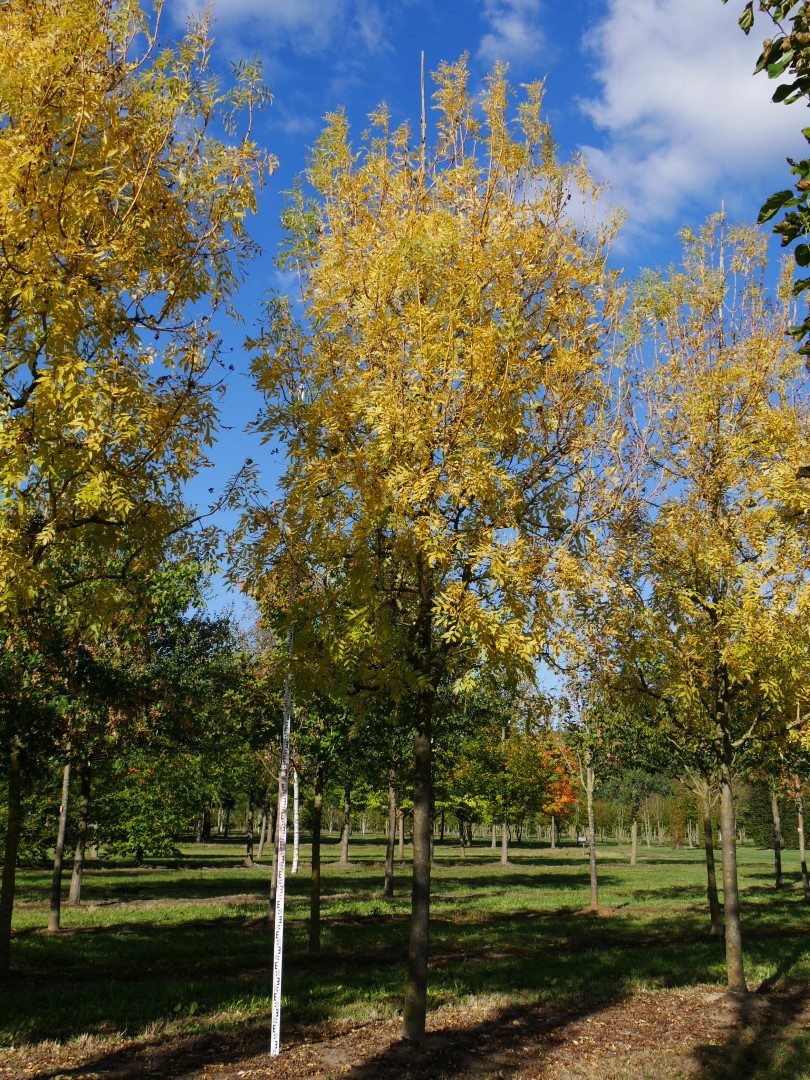 An average-sized tree with a conical crown and a stronger growth than 'Allgold'. Height circa 10 -12 m. The twigs are yellow and have green length-stripes and very contrasting black buds. The odd-pinnate leaves unfold yellow green and turn light green later growing as large as 25 - 30 cm. In autumn the leaf turns to a beautiful golden yellow that remains long. This ash has an inconspicuous inflorescence and generates many keys in thick bunches. 'Jaspidea' can be used as a road and street plant and in public gardens and parks. The tree prefers moist, nutritive soil. Winter hardiness zone: 4