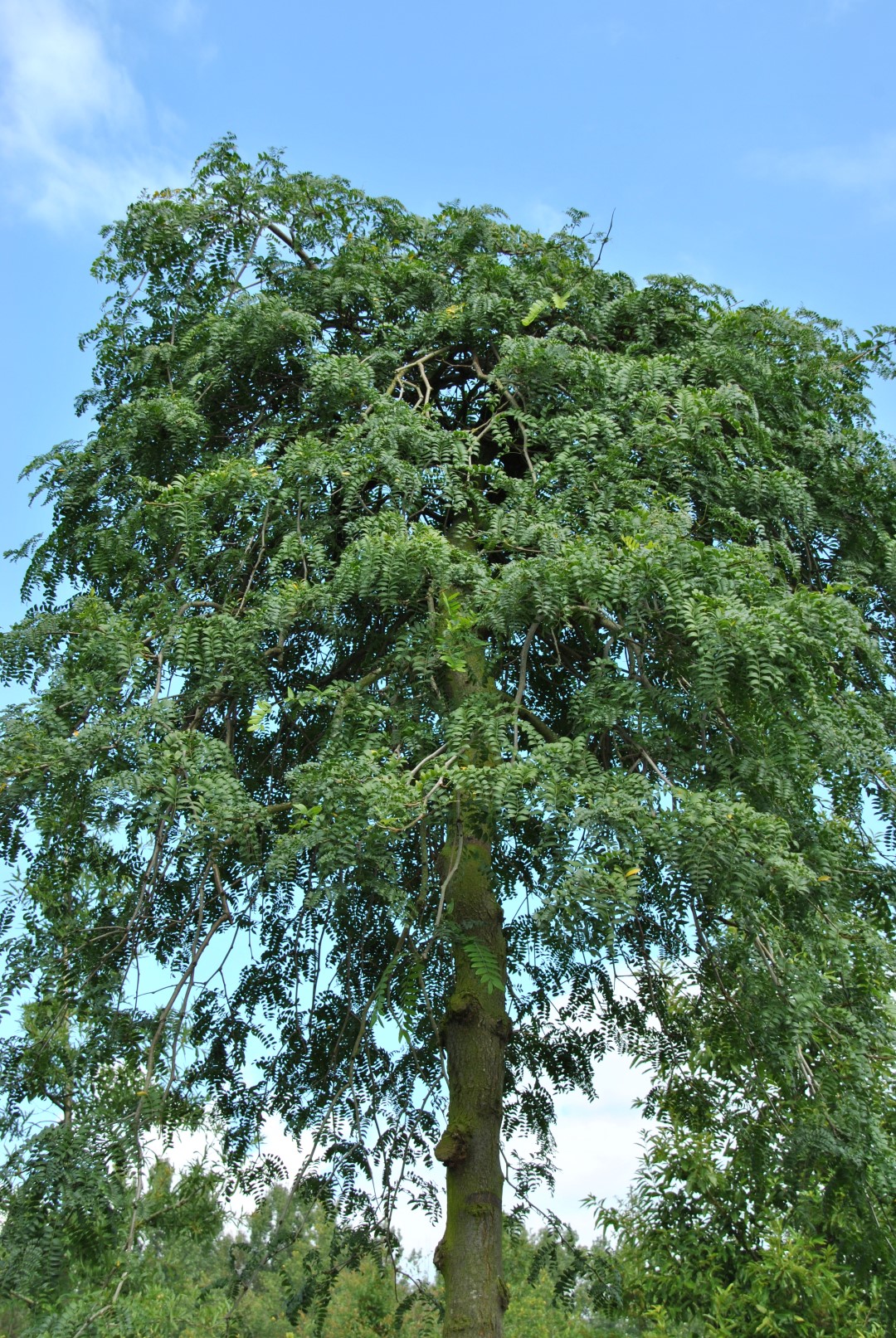 A cultivar with an irregularly growing open crown and a height of circa 5 m. The tree has gracefully hanging branches. If 'Emerald Cascade' is cultivated as a stem, it can be grafted both under and on top. The dark grey bark gets shallow grooves. The large, compound leaf is pinnate or twice-pinnate and has a dark green colour. It sprouts late and turns golden yellow in autumn. The separate leaflets are circa 3 cm long. It is a male variety with inconspicuous flowers in June. Applicable as a solitary in parks and gardens. Has deep rooting roots with many branches. Can be used in hard surfaces. Winter hardiness zone: 5a.