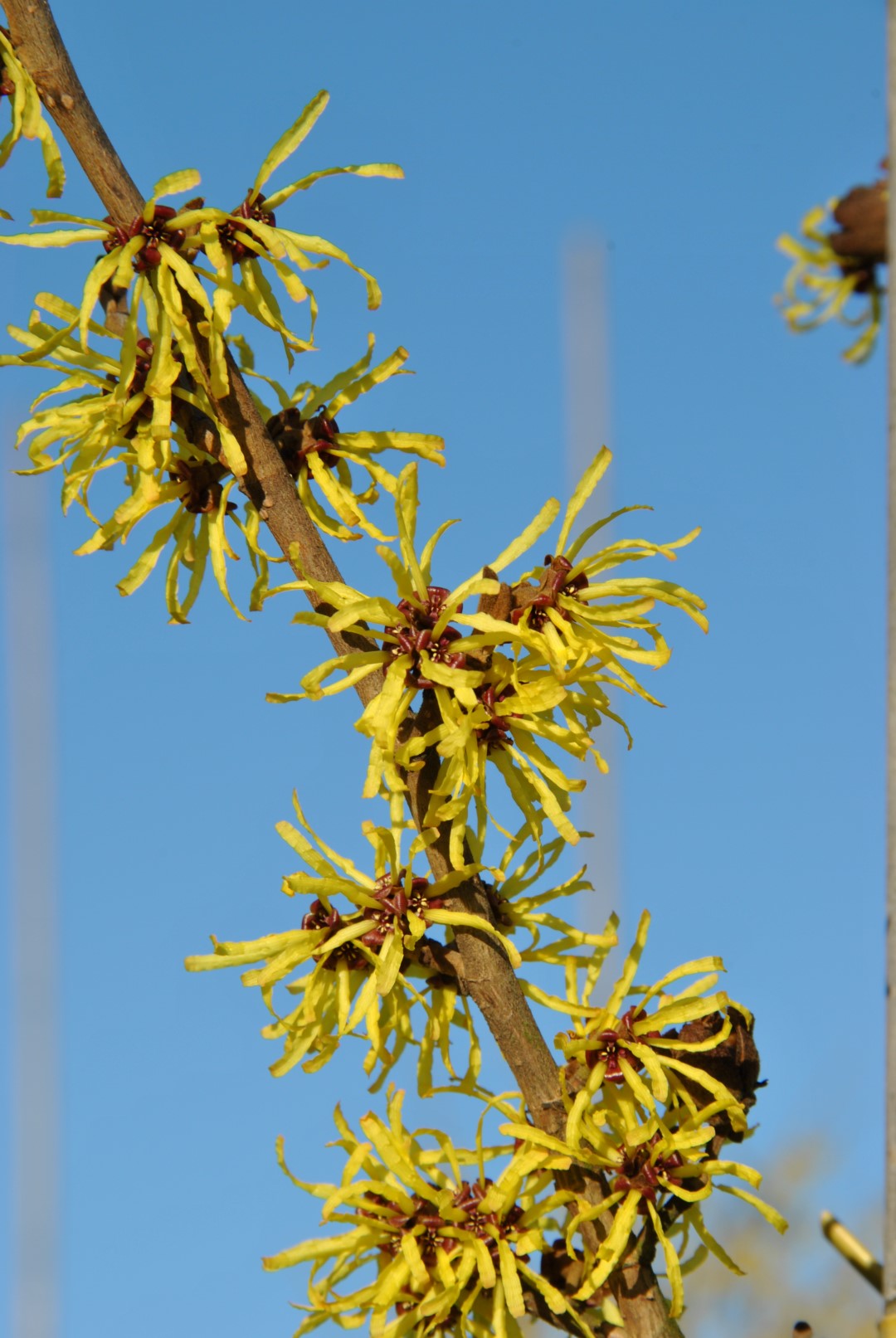 Relatively slow growing, fairly sturdy shrub, very occasionally a small tree. Has a regular, vase-shaped form, reinforced by its compact growth and dense branching pattern. The flowers are an intense bright yellow and, with a diameter of almost 4.5 cm, are among the biggest in the Hamamelis genus. They have hardly any fragrance, but this is more than compensated by the profuse blossoming. Flowers fairly late in the season, usually around mid-February/early March. Was named in 1985 by J.H.M. van Heijningen of Breda, the Netherlands, after his daughters Angeline and Elly.