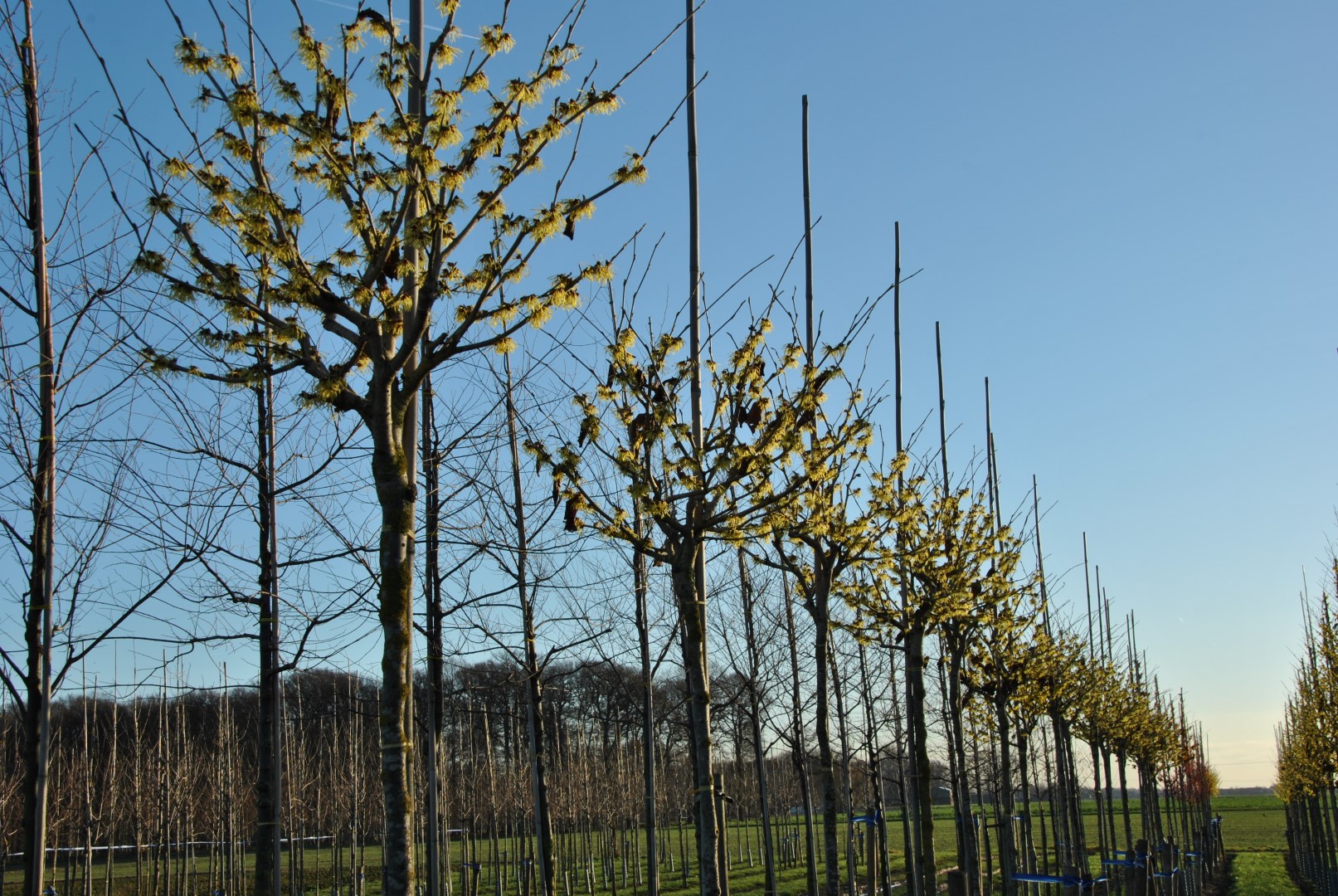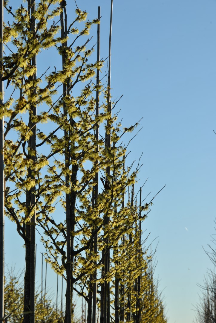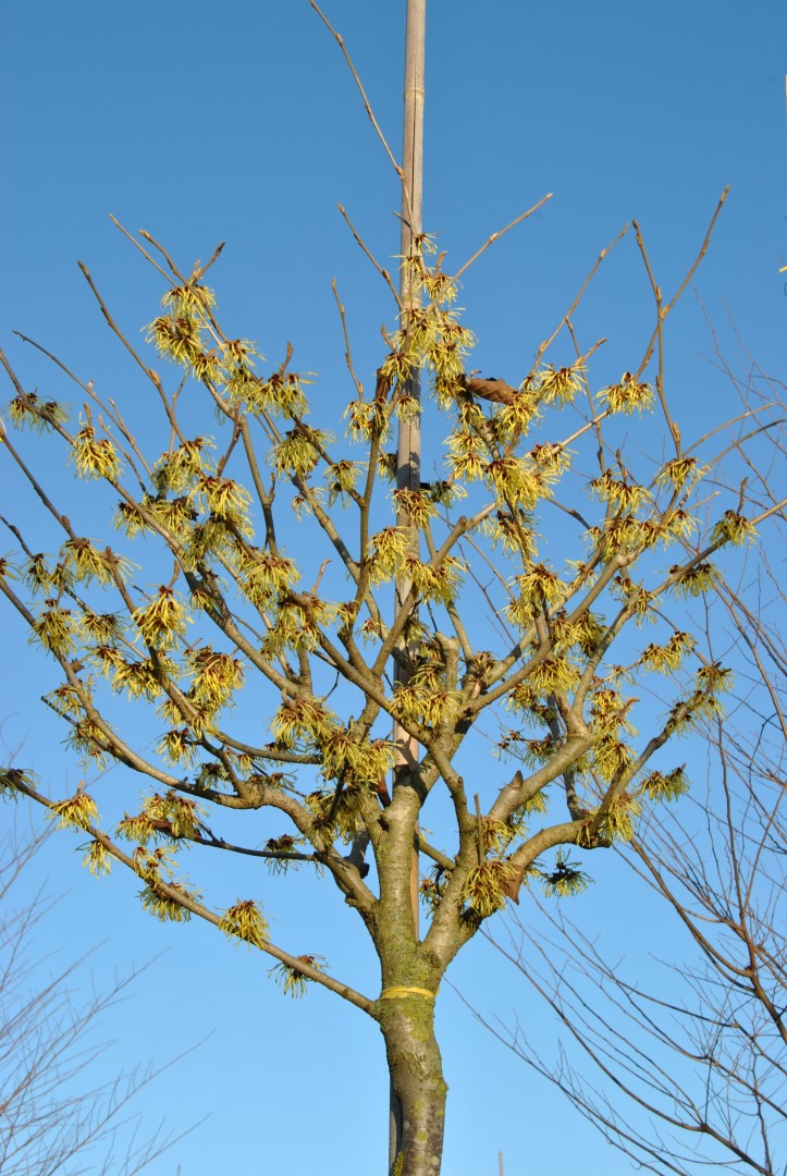 Vigorous, sturdy shrub to small tree about 3 m high and 4 m wide, with a broad, fan-shaped growth pattern and a semi-open crown. The slightly glossy mid-green leaf turns yellow in autumn. The very profuse blossoming occurs in December/January. The flowers measure about 4 cm and are an intense sulphur yellow. They have a strong, very pleasant fragrance and the plant blossoms profusely every year. The exact origin of ‘Pallida’ is unknown, but the plant was named in 1958 at RHS Wisley Garden, UK. ‘Pallida’ is the best known yellow-flowering cultivar and generally regarded as one of the best Hamamelis cultivars.