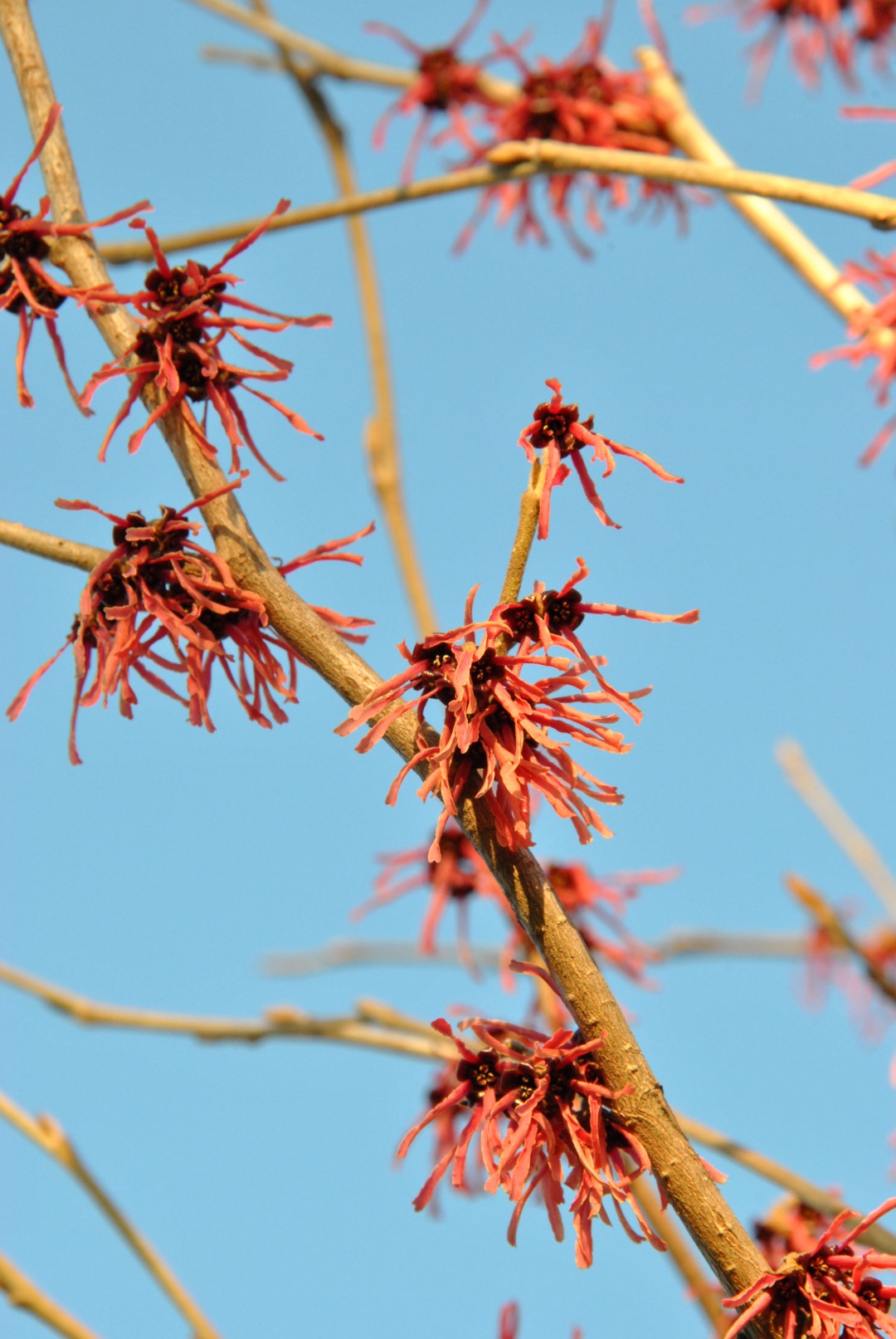 Hamamelis ×intermedia 'Ruby Glow' blooms in january.