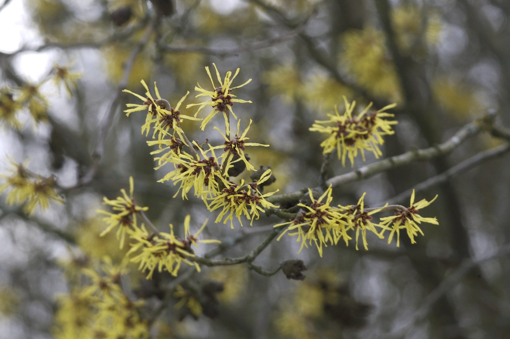 Hamamelis ×intermedia can eventually reach a height of 4 m, depending on the site and climate conditions.
