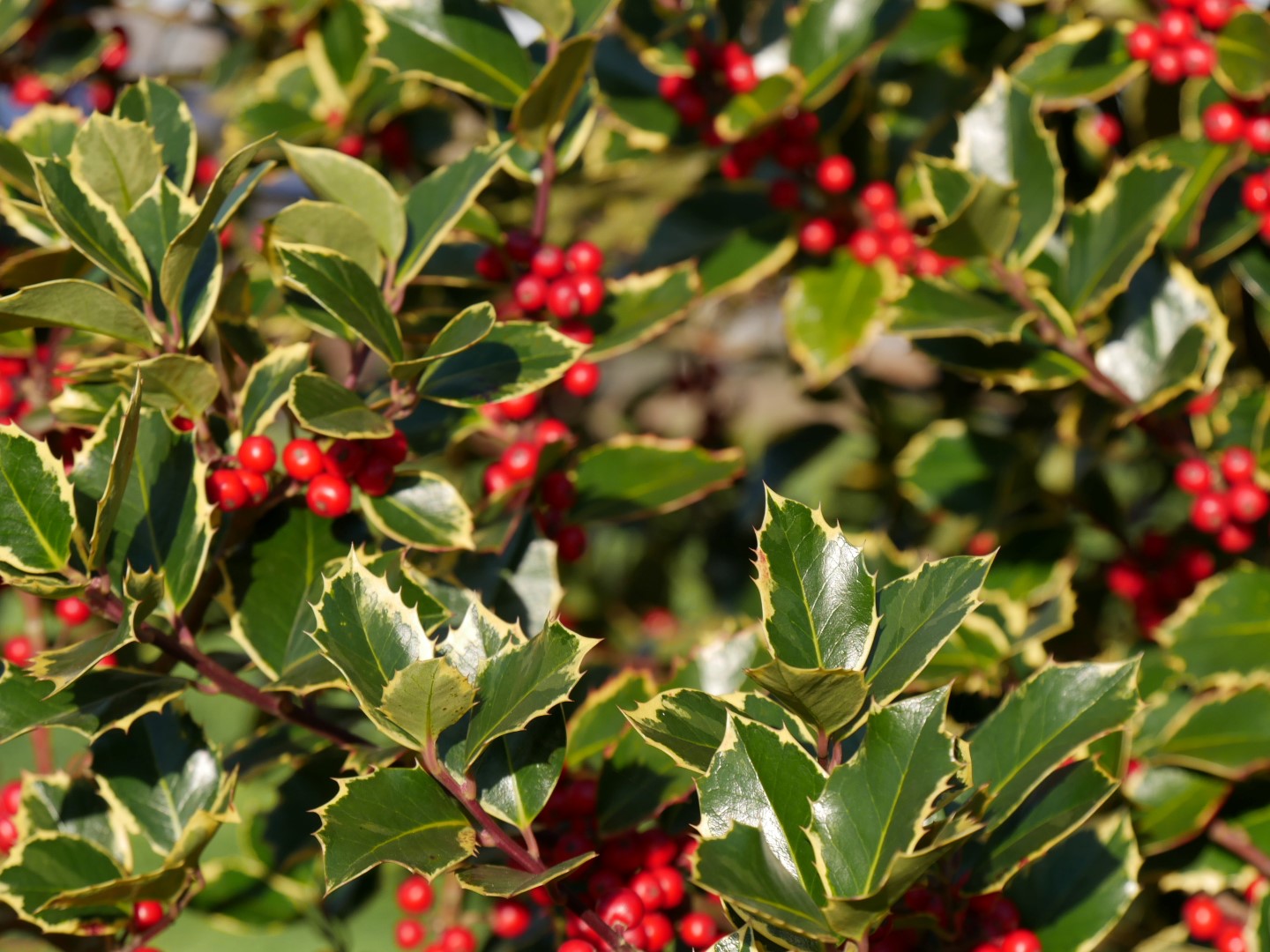 Medium-size tree with densely branched, broad pyramidal crown to about 8 - 12 m. Young twigs are bright green with cream stripes. The leaves are narrow ovate to elliptical, up to 7 cm long. They are glossy dark green with broad, cream coloured margins. Young leaves often coloured pinkish to light purple. The margins are slightly undulate, with 5 - 7 sharp prickles on each side. The flowers are fairly inconspicuous. This female cultivar can bear numerous bright red fruits. Prefers a humic, moist but well-drained soil and tolerates either acidic or calcareous soil. Also suitable for use as a wide hedge.