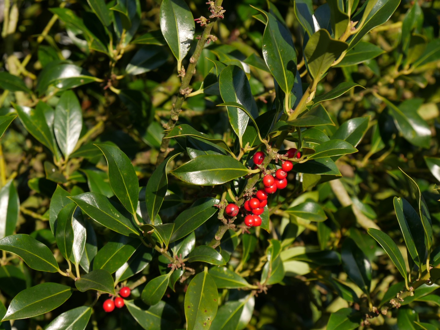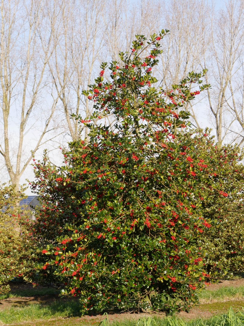 Grows from a shrub into a small or medium-size tree with a very densely branching, narrow pyramidal, later broader crown. The leaves are dark olive green and smooth-edged, or with few small spikes on the upper half of the lamina. The flowers are small and inconspicuous. In principle the flowers are female, but in practice they are self-pollinating. The flowers are followed by numerous glossy red berries from 8 to 10 mm across. Prefers a humic, moist but well-drained soil and tolerates either acidic or calcareous soil. Also an excellent hedge plant.
