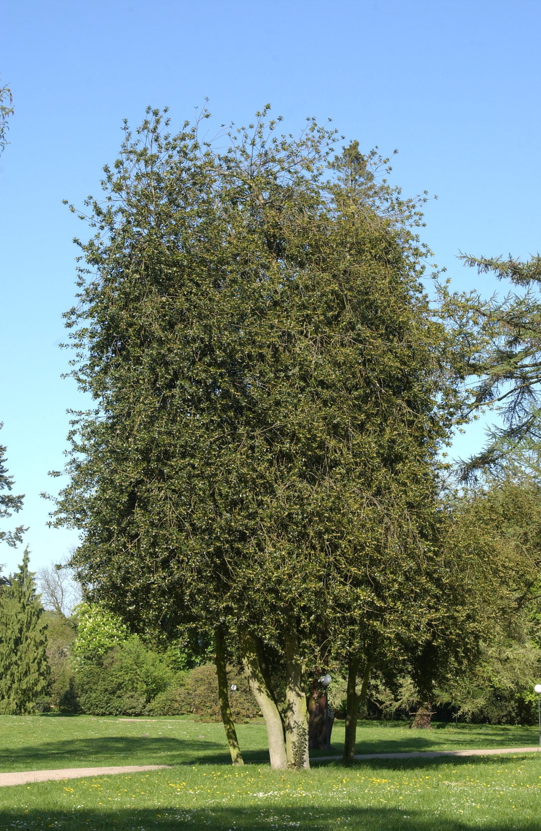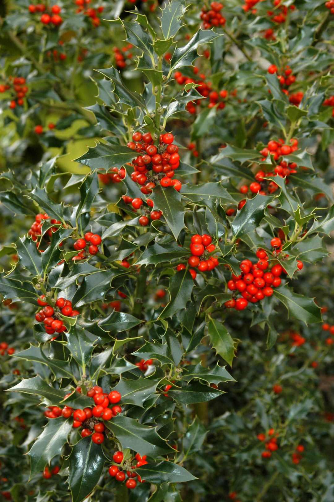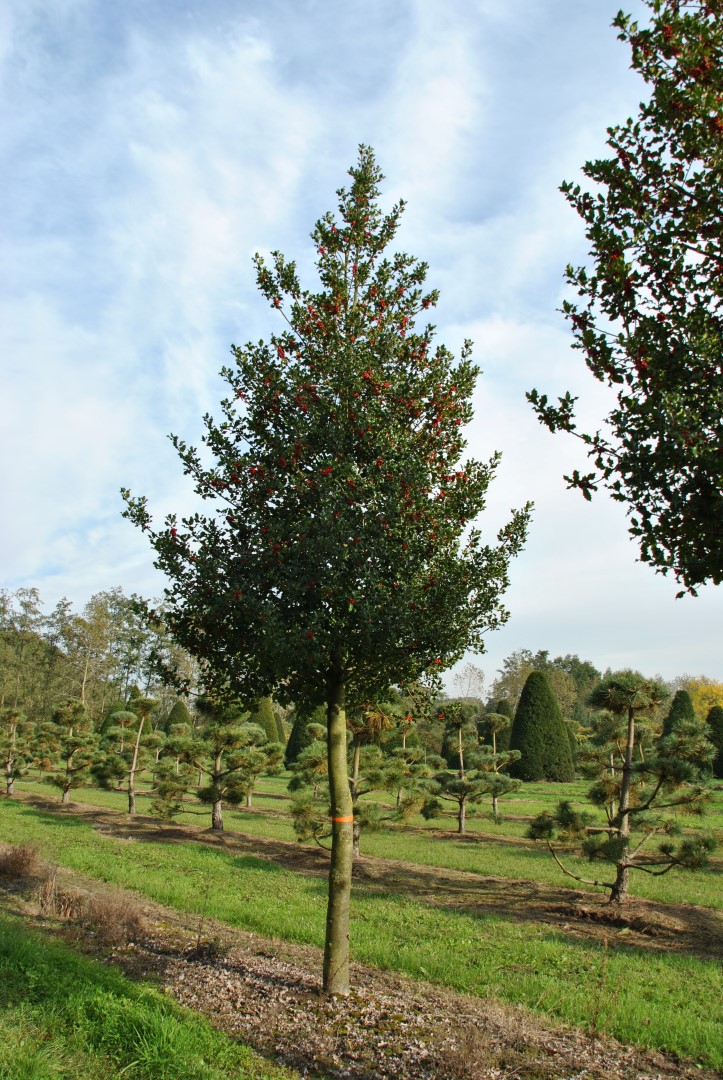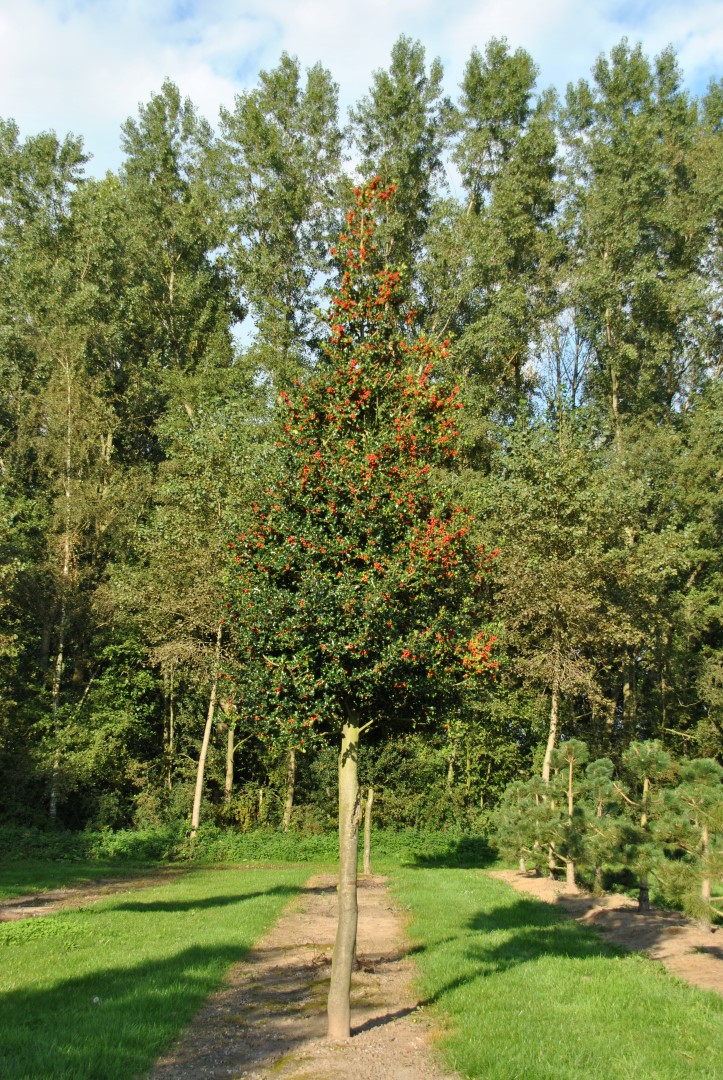 Grows from a shrub into a small or medium-size tree with a pyramidal to broad oval crown. The crown branches very densely. This effect is reinforced by the tough, evergreen leaf. The leaves are glossy dark green and have a very undulate margin with several pronounced prickles. The flowers are small and inconspicuous. They are hermaphroditic. The female flowers are followed by glossy red, fleshy drupes (commonly called ‘berries’). The Common holly is indigenous to western Europe and an important tree in the cultural history of various peoples. Prefers a humic, moist but well-drained soil and tolerates either acidic or calcareous soil. I. aquifolium is an excellent hedge plant as well as being used as a park tree, in narrow streets and in gardens. Dozens of cultivars have been named, many of which have variegated leaves.
