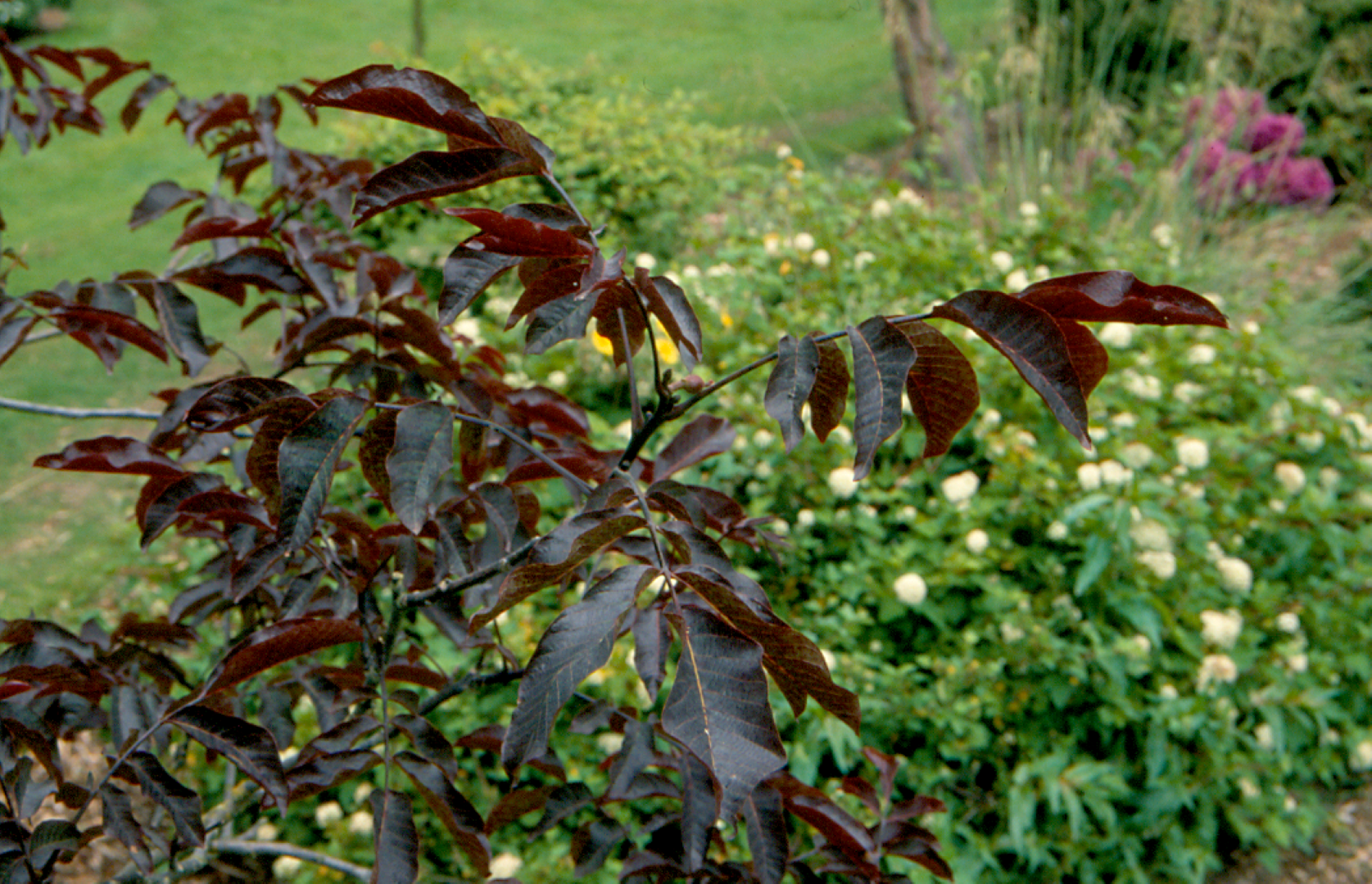 Slow growing, small tree with an irregular, round crown, up to about 5 m tall. The young twigs are purplish red, mature branches and the bark light grey and grooved. The imparipinnate leaf grows 20 - 30 cm long and consists of 5 - 9 leaf segments. These emerge glossy red but turn matt purplish red in summer. The blossom and fruit are typical of the species, but ‘Purpurea’ does not generally bear many fruits. Is notably less hardy than other J. regia cultivars. Roots very deeply and much prefers easily penetrable, open soil.