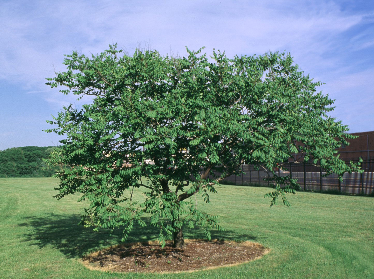 This American selection initially shows a slower growth rate than the species. The rounded crown grows steadily broader. Widely-spread branches bend downwards. The large, pinnate (sometimes doubly pinnate) leaves consist of 7 - 15 leaf segments. These are lobed, approx. 7 - 10 cm in length and have a serrated edge. The leaves are a bronze colour in the spring and turn yellow to orange in the autumn. The numerous small, yellow flowers are in terminal plumes approx. 30 cm long. The tree flowers 6 - 8 weeks later than the species and the flowers are often very numerous. The bladder-like fruit, approx 4.5 cm long, change colour from green to bronze and contain a few black seeds. The fruit remains on the tree for a long time. This tree prefers a sheltered site since young specimens can suffer frost damage, but recover well.