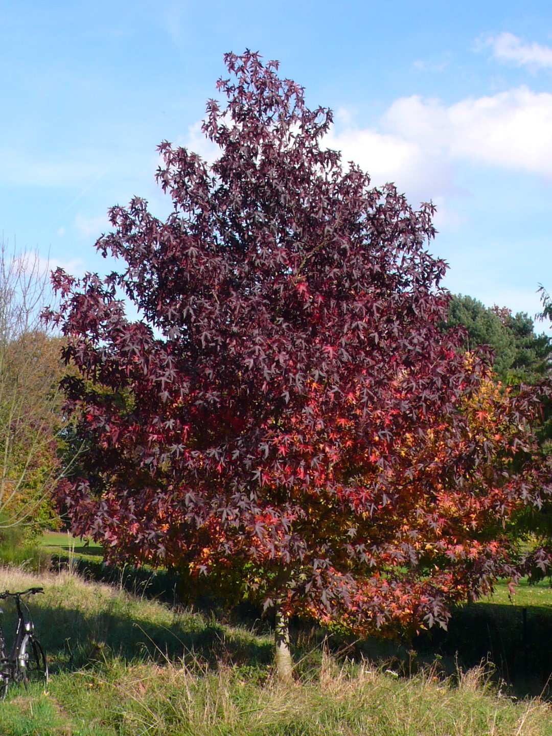 The leaves of Liquidambar styraciflua 'Andrew Hewson' turn yellow, orange, red, purple in autumn.