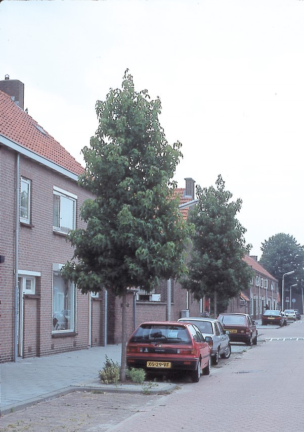 Liquidambar styraciflua 'Festival' bears a strong resemblance to the species but is distinguished by its pyramidal, narrower crown shape that remains so. 'Festival' grows considerably faster than the species, especially in its younger years. Height 20 - 25 m. Older branches develop thick grey corky wings. The 5-lobed (sometimes 7-lobed) leaves are deeply incised. The autumn colour passes from yellow and orange to reddish-purple. When the tree is planted on a humid site the leaves turn a more intense shade of red. Fruit capsules, that remain hanging in the tree for a long time, appear after the unremarkable flowering. Is not resistant to long-lasting dry periods. Winter hardiness zone: 5b