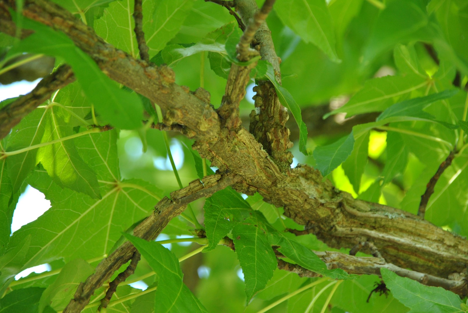 dark grey, deeply grooved, many corky fissures on branches and twigs