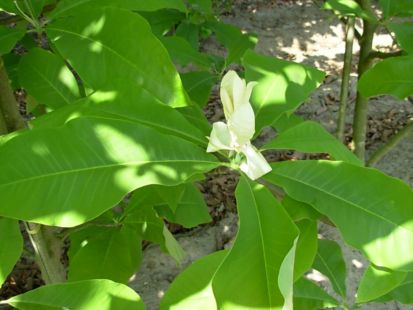 A big, often multiple-stemmed tree with a loose, spreading crown and a smooth bark that turns from light brown into grey. The dark green to purple-brown twigs have grey lenticels and dark purple-brown buds. The obovate leaf is very large, 40 to 45 cm at a maximum. On top the leaf is shiny and fresh green, underneath it is strikingly blue pruinose. In early summer cream-white flowers appear that can reach 20 cm across. The cream-white petals are sometimes greenish or purple red tinged. The stamens are strikingly red at the base. The flowers have a strong but pleasant melon-fragrance. They are followed by elongated, purple-red compound receptacles that are 12 - 17 cm large. These fruits contain orange seeds. Becomes a magnificent solitary cultivar with age.
