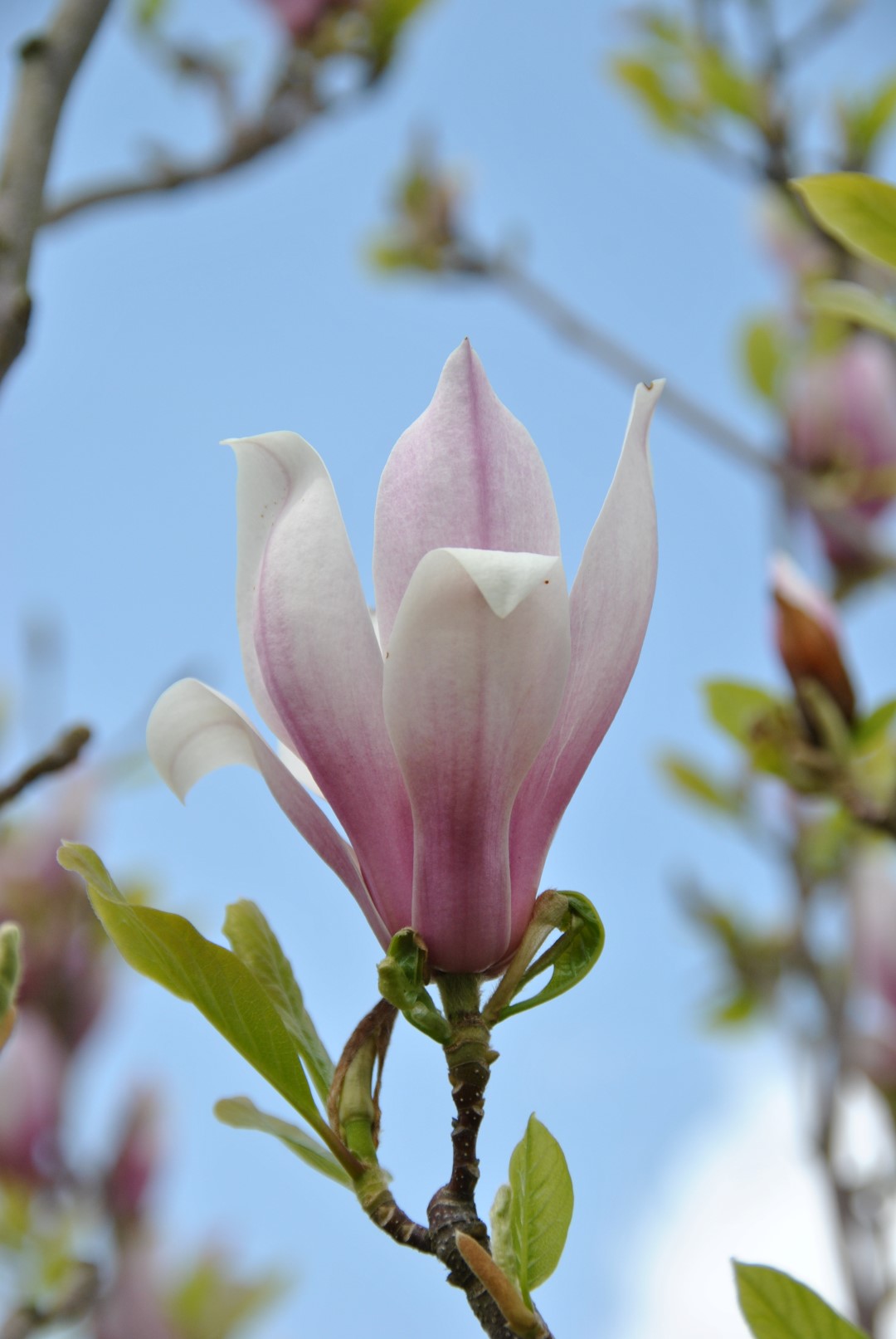 Grows from a large shrub into a broad, ovoid, small to medium size tree with a height of about 5 - 8 m. The flowers have the characteristic vase-shaped tulip shape of the Magnolia. They are 10 - 20 cm in size. The 6 - 8 petals are purplish red to light pinkish red with a darker base on the outside. The inside is whitish pink to white. Usually blossoms in early May. A second, less profuse blossoming often follows in August. Was named in China and imported to Europe from there. Suitable for use in parks and gardens.