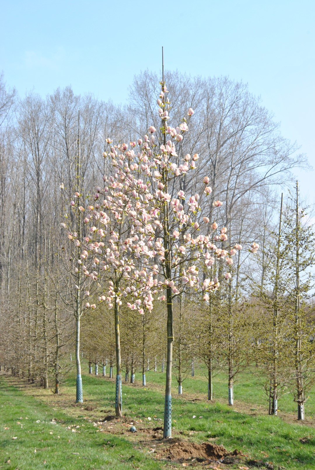 A hybrid between M. denudata and M. liliiflora. It is a slow-growing, large shrub that can sometimes grow into a multiple-stemmed tree. At first it has a spreading vase shape, but when maturing it spreads more, generating an ovoid crown. In the case of low branches, old branches can bend onto the ground. The spread may be as large as the height. It is one of the richest flowering Magnolias. There are more than 40 named cultivars which may differ considerably from each other with regard to the colour and the shape of the flowers. Colours vary from completely white to white with pink to dark pink hues. The flowers appear before the leaves. A late night frost may damage the flowers. As it usually concerns sterile varieties, production of fruit is practically absent. The fleshy roots grow both shallow and deep. Poor tolerance to dry soils.