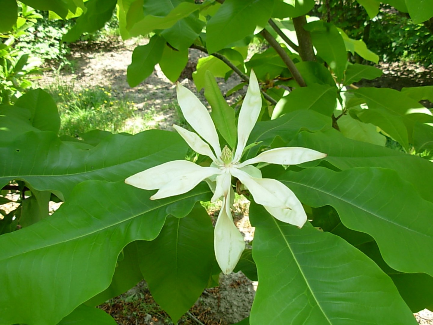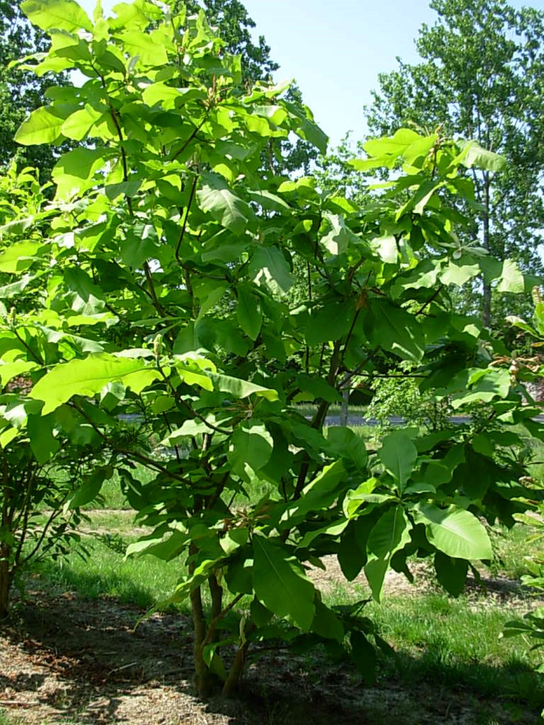A big, multiple-stemmed tree with a loose, spreading crown and a smooth grey bark. The purple brown twigs have a thin layer of wax and have brown-purple buds. The obovate leaf is extremely large, 40 - 50 cm at a maximum and the topside is shiny and fresh green. The underside of the young leaf is light grey-green and slightly haired. In summer cream-white, bowl-shaped flowers appear that are more erect than M. hypoleuca. The cream-white petals are 10 - 12 cm long. The long stamen are purple at the base. The flowers emit a faint, slightly unpleasant odour and are followed by ovoid, purple-red fruits that are circa 10 cm. Inside the fruits there are carmine-red seeds. After years a magnificent solitary that requires quite some space.