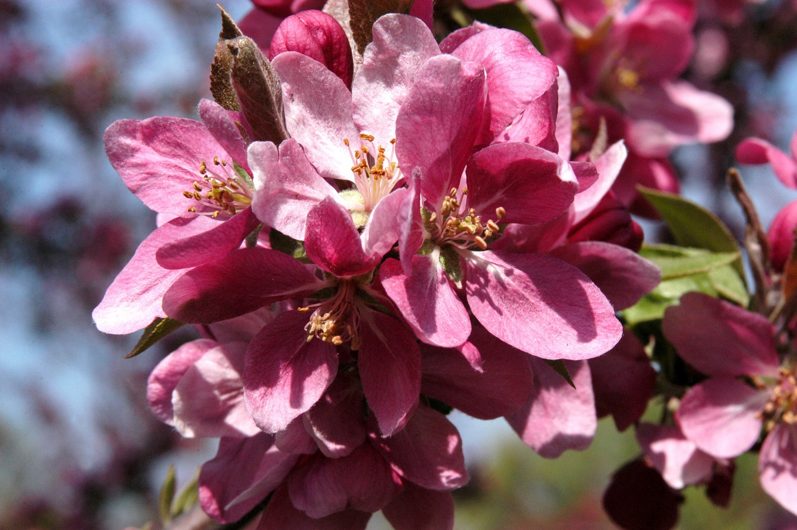 Malus 'Hopa' has a somewhat variable crown with branches spreading wide. Height 4 - 6 m. The oval leaves are purplish-green. The flowers in bud are carmine coloured but turn dark lilac-pink to pale lilac-red after opening: they are single. The diameter of the flower is approx. 4 cm. The fruit is bright red and remains hanging in the tree until mid-October. Diameter of fruit 2 - 3 cm. Can be used in parks, public gardens and small gardens. It makes heavy demands on the soil as regards moisture supply and fertility. 'Hopa' is very sensitive to scab. Winter hardiness zone: 4
