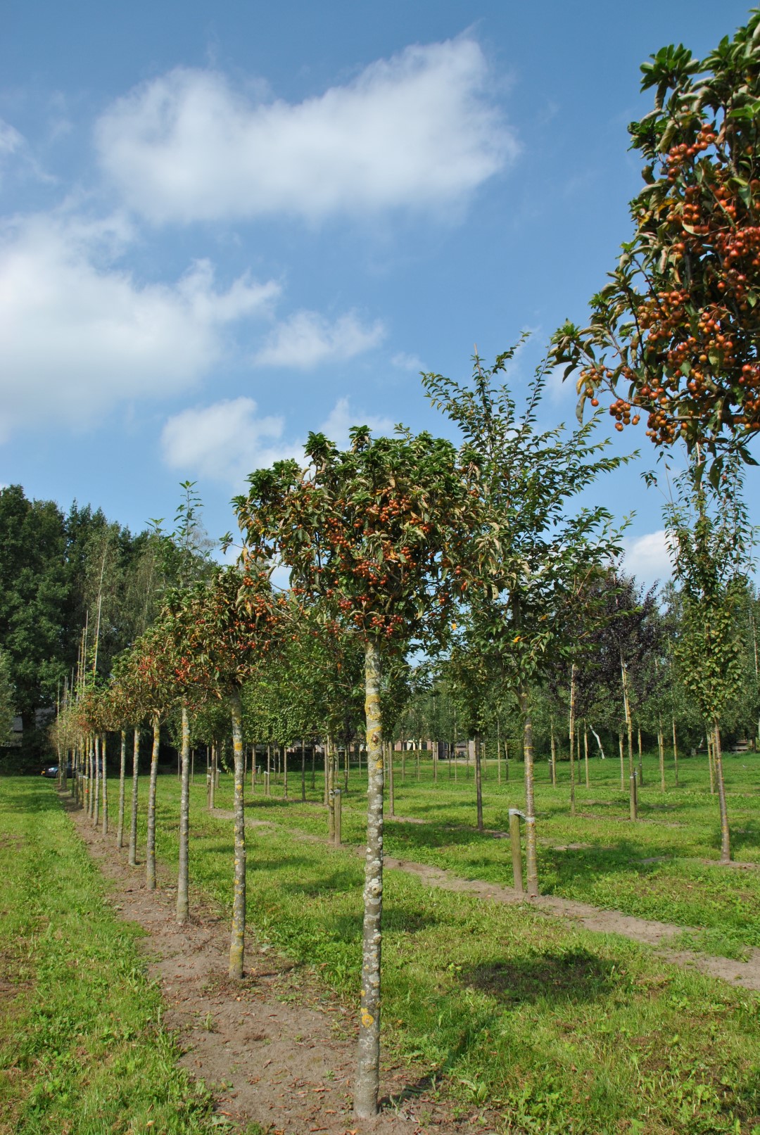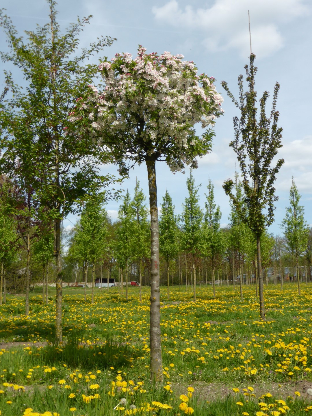 A slowly growing crab apple that is often grafted onto standard. This produces a small tree that’s eminently suitable as a solitary in small gardens. Depending on the graft height the tree grows to 3 - 4 m. The crown is flattened spherical. The tree produces abundant flowers, light red fading to almost white. In autumn many small yellow fruits with an orange blush appear and remain in the tree for a long time. The tree grows best in nutrient-rich, not too dry soil. It is a very vigorous hybrid cultivar produced by Sapho in France around 1990.