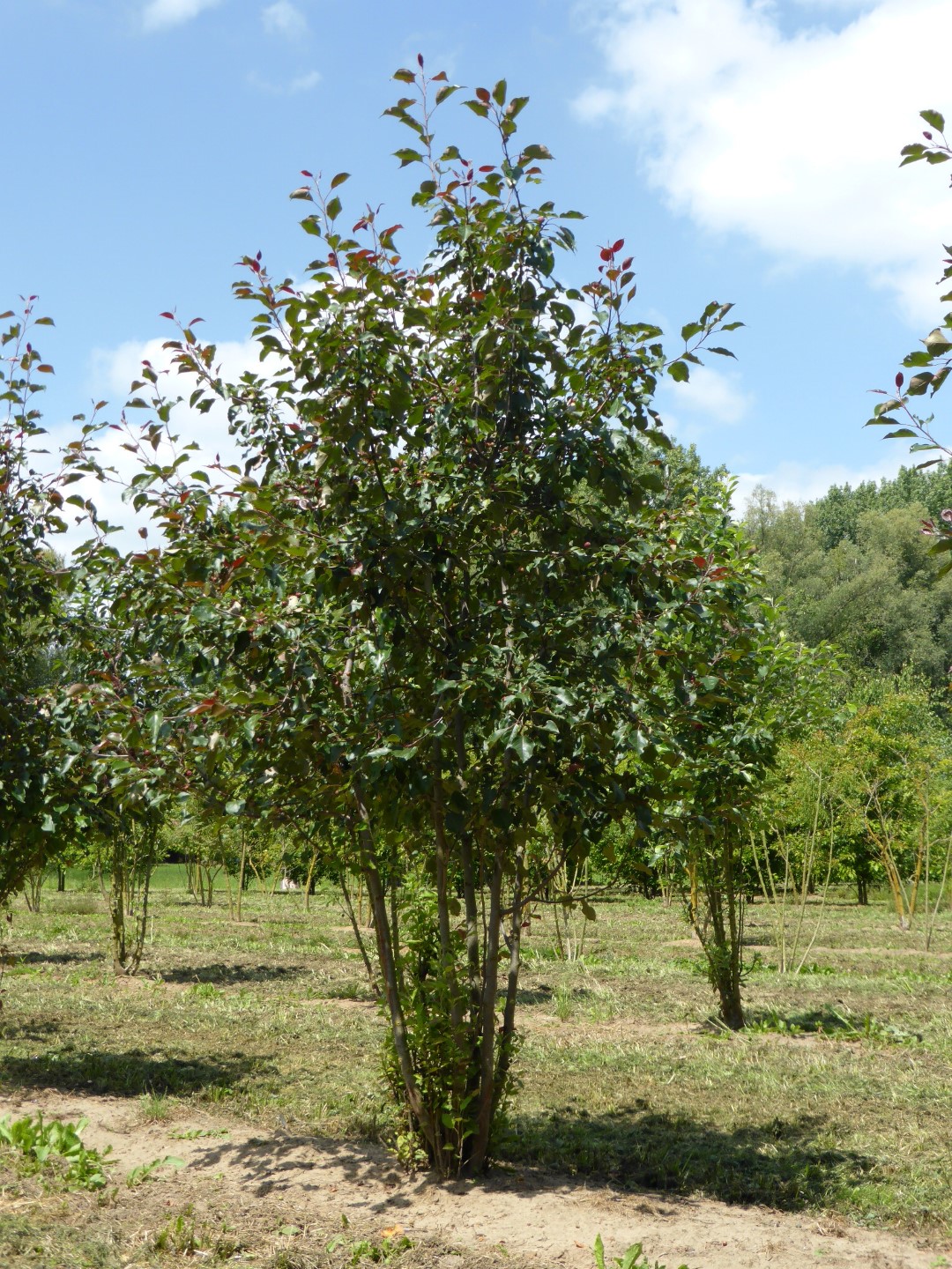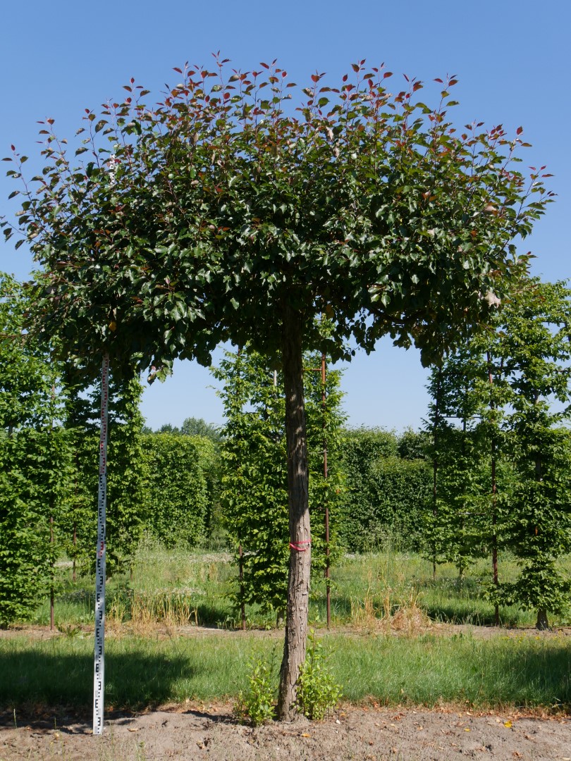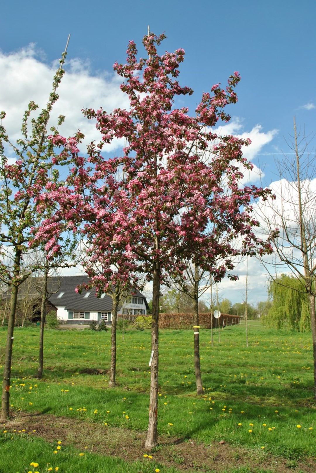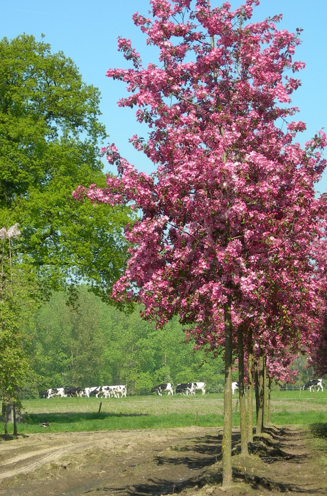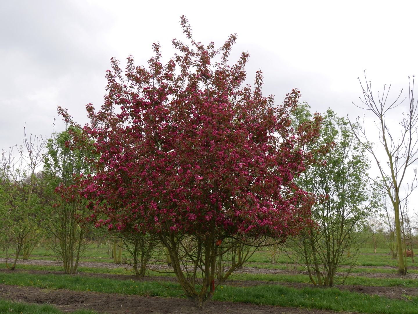 Small tree that starts off by growing vertically. The branches grow outwards, later becoming somewhat pendulous so that the shape of the crown becomes more rounded.. The twigs and bark are hairless and dark brown. The young leaves are dark brownish-red. In the summer they turn dark green with a somewhat reddish glow. The flowers, almost 5 cm in size, grow in bundles of 4 to 8 together. In the bud the flowers are brownish-purple but they turn dark purplish-pink when open. The flowers are single. The flowers are followed by numerous elongated orange-yellow fruits, Ø up to 2 cm, that do not remain on the tree for long. 'Rudolph' can be used in parks, gardens and public gardens. Can also be used as an avenue tree because of the small fruit. Shallow roots with a vigorous root system. The tree grows best in nutritious, not too dry soil. Moderately scab-sensitive and extremely winter hardy.