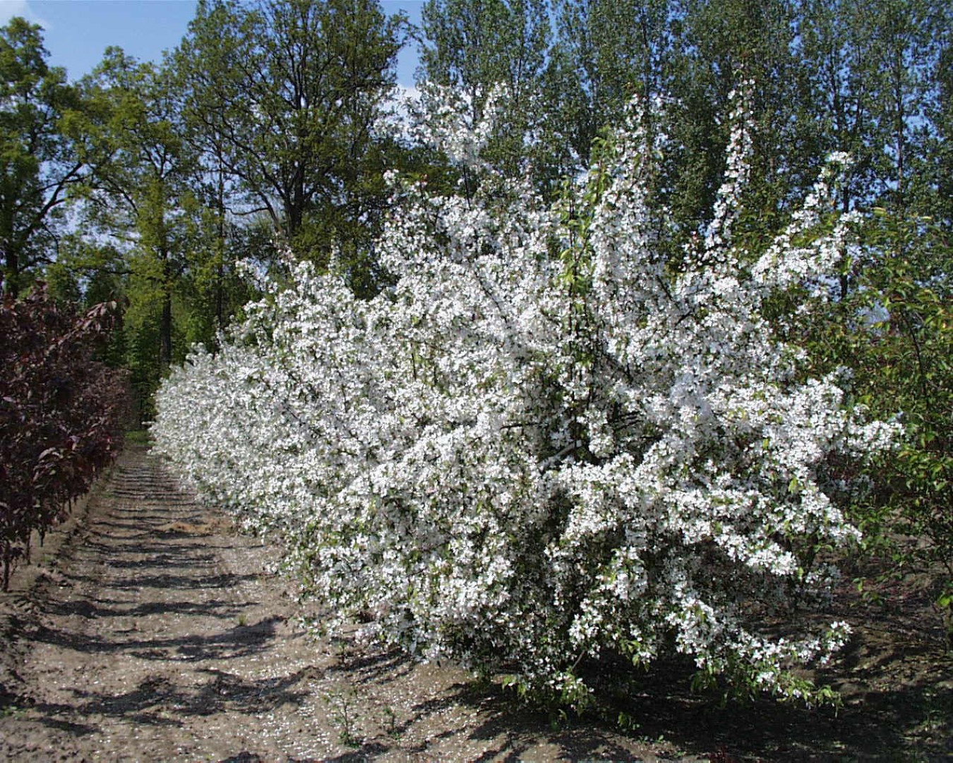 Medium-size tree with a broad pyramidal, eventually almost round crown, to about 12 m. The young twigs are reddish with dense, silver grey hair. The older bark is grey-brown and smooth. Only in older trees do thin plates of bark flake off at the base of the trunk. The leaf is ovate-elliptical, bluish green on top and woolly on the underside. It turns purple to orange in autumn. The white flowers open out of pink tinted buds in around mid-May. These are single and approx. 3.5 - 4 cm. The beautiful fruits are up to 3 cm and yellow-brown with red dots. They remain on the tree into October. In 1996 the NAKB (Netherlands Inspection Service for Horticulture) named a clone that was already present in Dutch nurseries and whose original tree stands in the Arboretum Belmonte at Wageningen. Slightly susceptible to scab.