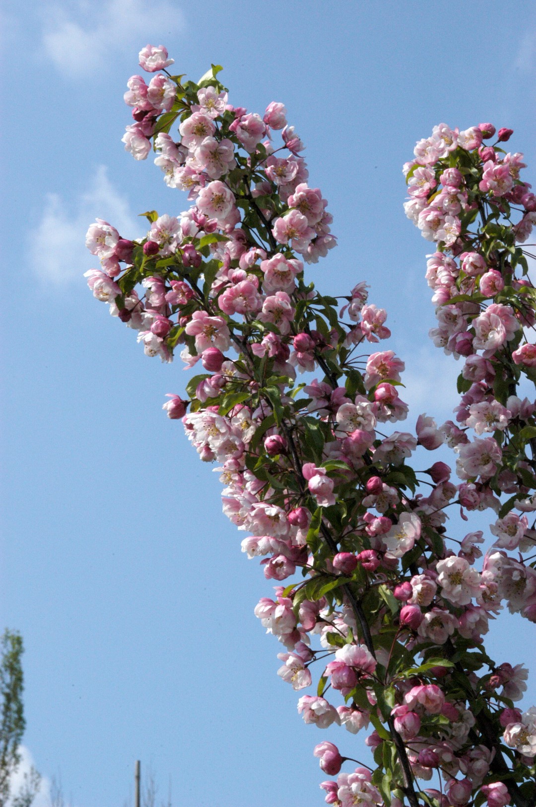 Malus 'Van Eseltine' is a fairly old (1942) American cultivar. The tree has a narrow crown that later becomes broad and vase-shaped. Height approx. 6 m. The leaves are dark green. The semi-double flowers are deep pink and very large, Ø 4 - 5 cm, and emerge in early or mid-May. The unremarkable fruits are yellowish-green and 1.5 - 2 cm in diameter. Can be used in parks, streets and gardens. It makes heavy demands on the soil as regards moisture supply and fertility. Sensitive to sea wind. Winter hardiness zone: 4