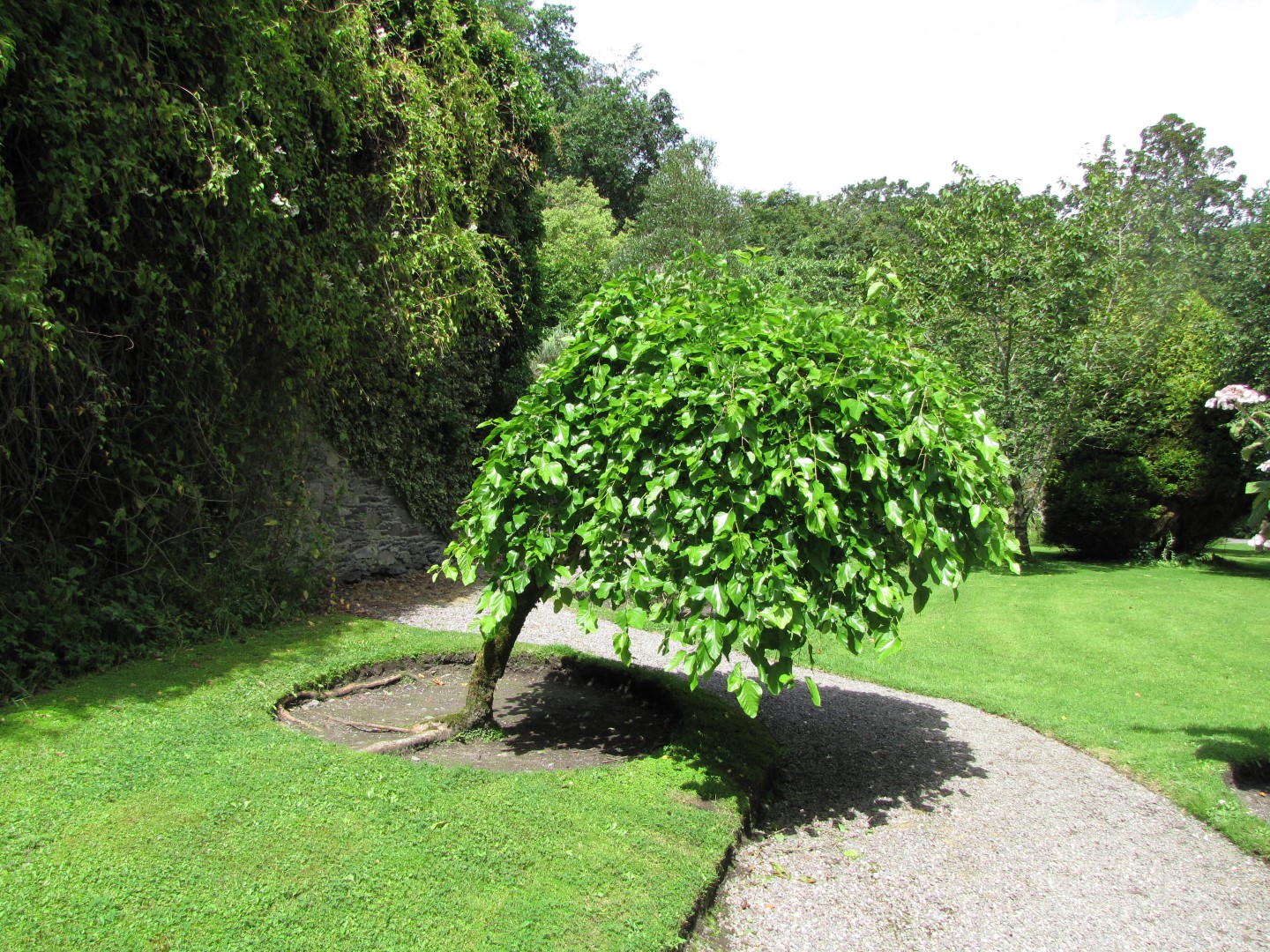 A cultivar of the white mulberry grafted on a stem. It forms a small tree with branches that grow vertically downwards at first. In older specimens the branches grow out somewhat in the width. It can eventually attain a maximum width of 4 m. The final height attained depends on the height of the graft. M. alba is used as the graft trunk. The irregularly shaped leaves are often deeply incised and can grow to a length of approx. 14 cm. The leaves are a glossy light green and rough to the touch. The monoecious tree has unremarkable male and female flowers. The small fruits resemble raspberries and are edible. They have a bland to slightly sweet taste. This is a tree for a sunny, warm, sheltered site. Saplings are sensitive to frost. Likes chalky soils and grows in poor soil.