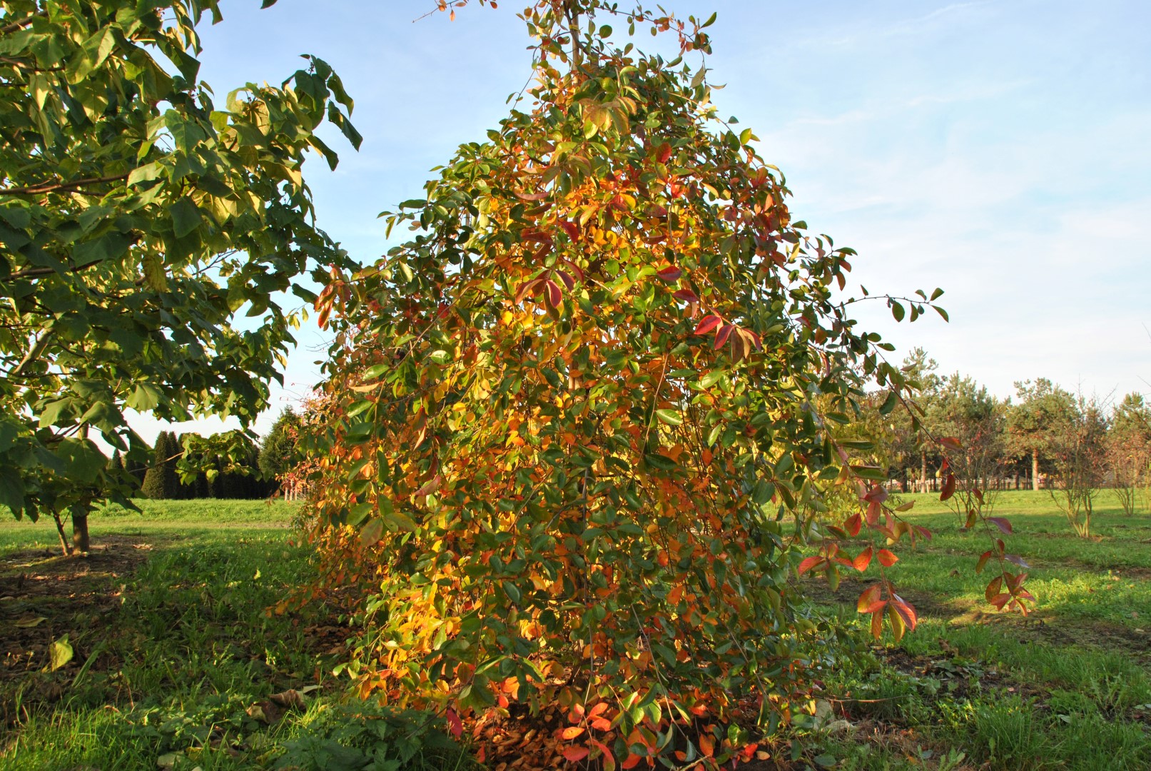 The leaves of Nyssa sylvatica 'Autumn Cascades' turn yellow, orange, red in autumn.
