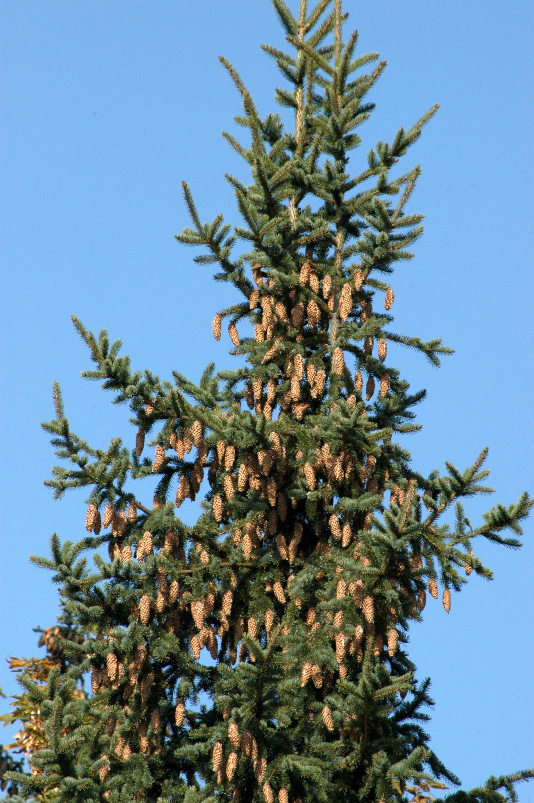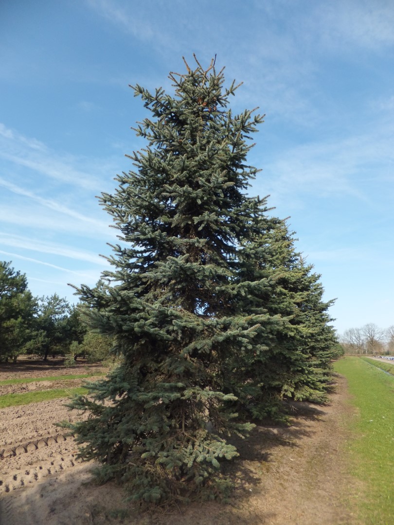 Large tree with a pyramidal growth habit and dense, very regular branching. The bark is grey-brown, later deeply grooved. The young twigs are yellowish brown to orange-brown and go well with the blue-grey needles. These are stiff and spiky, 2 - 3 cm long. The long cylindrical cones are green first, turning yellowish brown when ripening. The forma (f.) glauca is the more or less ‘blue-grey needled’ form of P. pungens. Because it occurs in nature and reproduces by seeding, it is naturally quite varied. In culture, the tree is usually propagated vegetatively which means there is one clone. The tree has few demands as to soil provided it is adequately moist. A very useful conifer due to its high tolerance to dry air. Good wind tolerance.