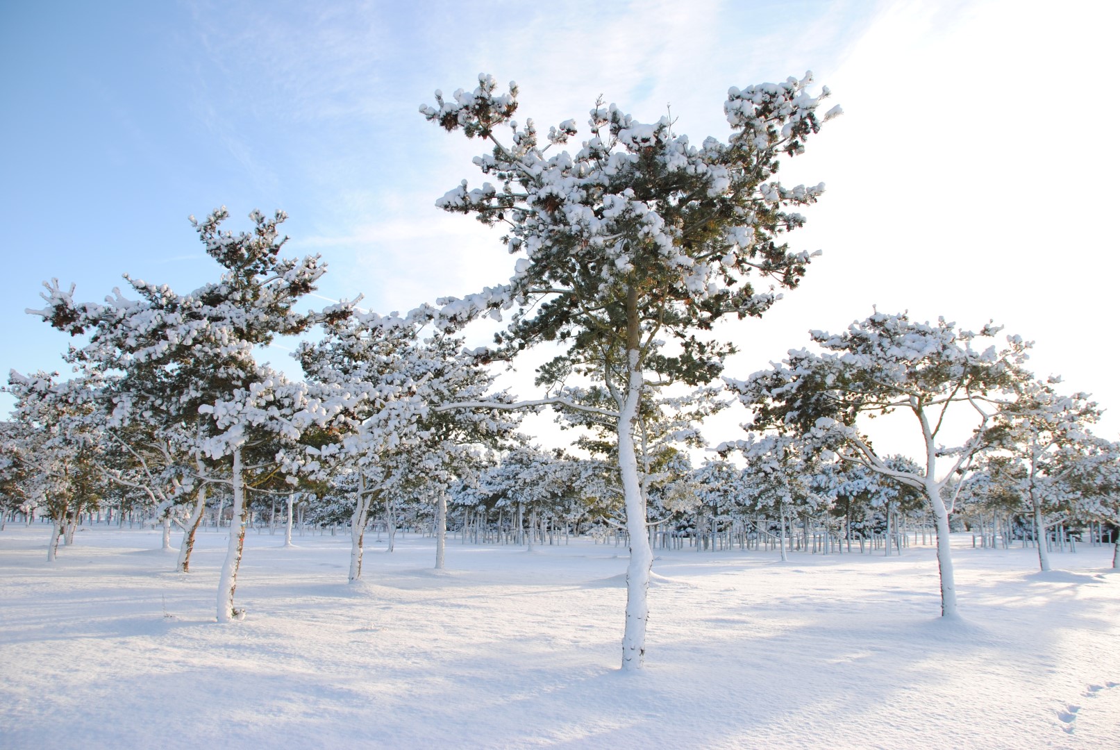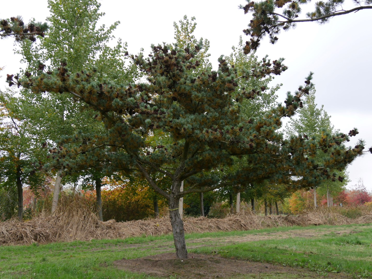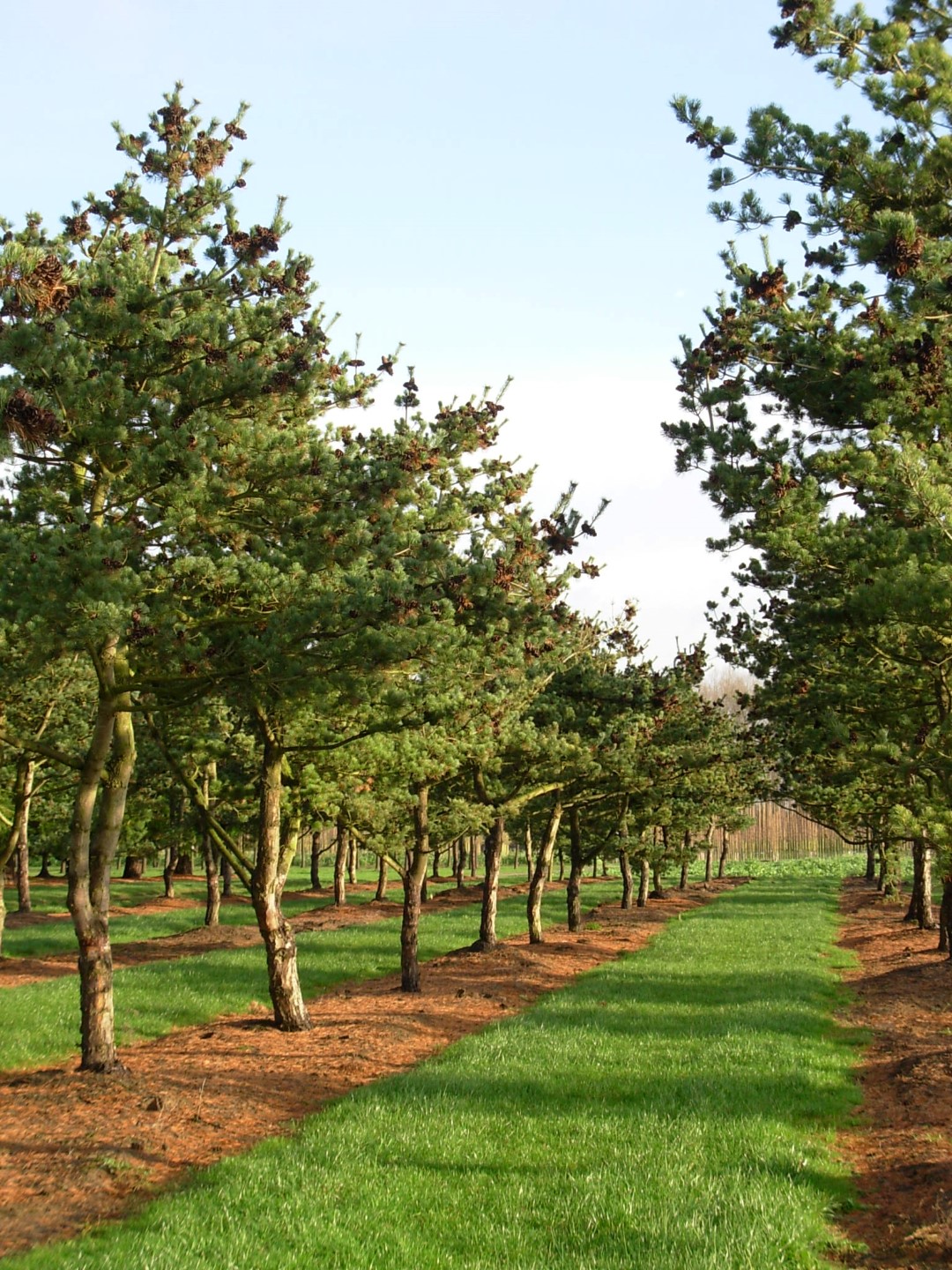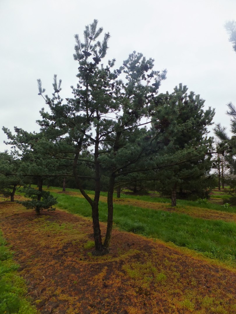 Slow-growing tree that remains narrow when young but later grows asymmetrical and broad. The crown is semi-closed and more irregular than the species, and the lower branches, which are often shorter, hang down slightly. The trunk is purplish grey and smooth, but darker and peeling later. Twigs are bare, sometimes with fine hairs and greenish brown. The very twisted needles grow in bundles of 5 grouped primarily at the end of the twigs. This produces brush-like tops. The needles have a more striking blue colour than the species. Even young specimens already have hanging cones. Sometimes they grow singly, sometimes in groups. Tolerates sea wind, is suitable for planting in industrial areas, and requires a sunny site. Thanks to the decorate shape of the bluish grey needles, 'Glauca' is often grown in private gardens.