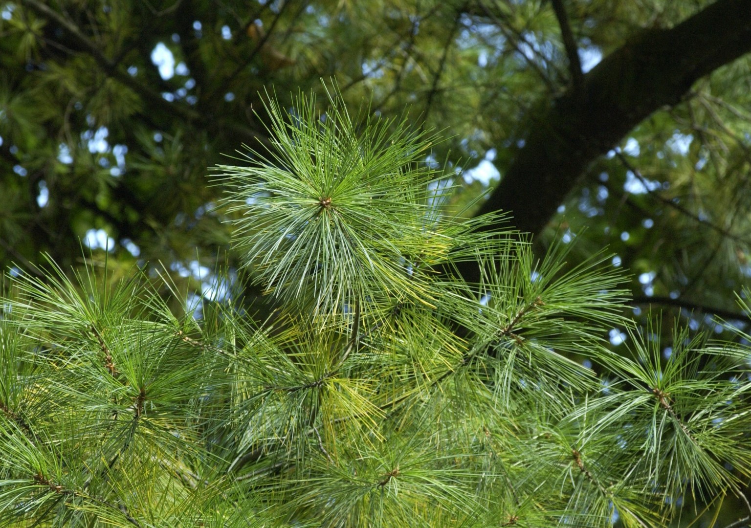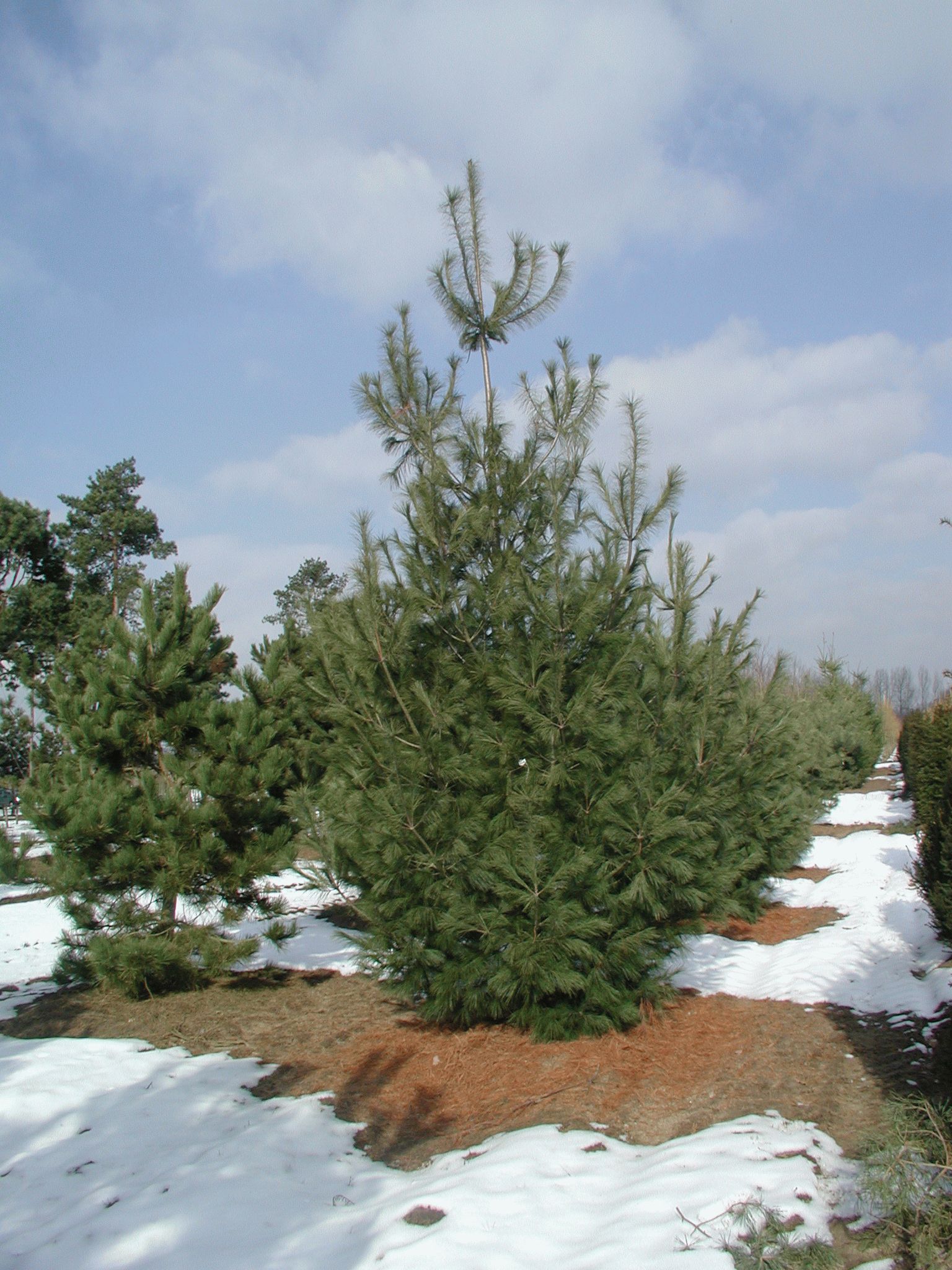 A quickly growing, decorative Pinus with one of the primary decorative values being the colour of the needles. Forms a straight, vertical trunk with a crown that is at first narrow and later broad and pyramidal. Older trees develop a horizontal branching pattern and form a fan-shaped crown. In its original habitat, this is the conifer that grows the highest, reaching heights of 60 – 70 m. First the trunk is smooth and thin, but later becomes deeply grooved. Young twigs are olive green to greyish brown and shiny, usually with fine hairs, but sometimes bare. The thin, soft needles are a shiny bluish green and remarkably thin. They are 7 to 14 cm long and not twisted. The narrow, cylindrical cones are slightly curved. Pinus strobus develops a very strong root system and is unsusceptible to air pollution.