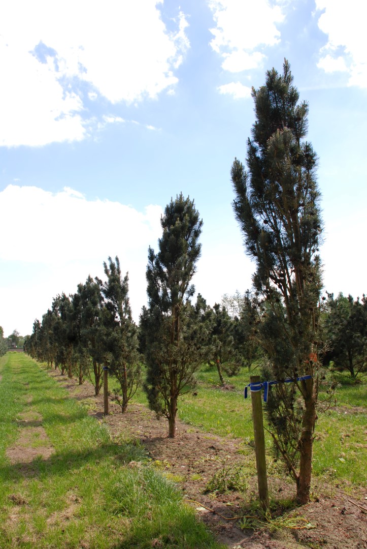The almost vertically growing twigs and branches create a very slender, columnar tree. When young, its growth can be somewhat slow but afterwards the tree can grow relatively quickly to a height of 15 m. The twigs are strikingly orange-brown. The mature bark is grey-brown and peels off in rough strips. The stiff, rather short needles have a slight twist and are 3 - 6 cm long. They are in twos and blue-green. The grey-brown cones hang alone or in clusters of 2 to 5. This Pinus even grows in extreme conditions although it prefers well-drained, lightly acidic, quite dry soils. An unusually hardy tree. Very resistant to (sea) wind and not sensitive to air pollution. The cultivar name ‘Fastigiata’ was given to every columnar P. sylvestris in the 19th century. This means there is a range of clones around that differ slightly from each other.