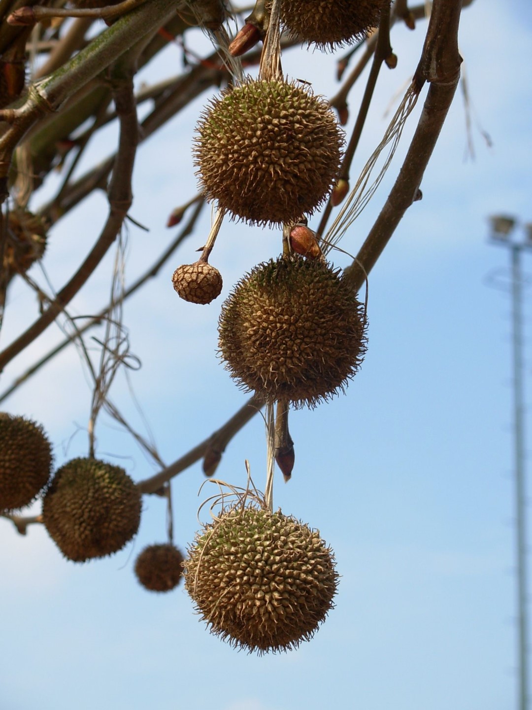 A tree selected at the same time as P. x hispanica ‘Malburg’, from an old avenue in Huissen, the Netherlands. Distinguishable from the species by relatively narrow, oval crown shape that is slightly narrower than ‘Malburg’. The scaling bark, characteristic to plane trees is also found in ‘Huissen’. The broad palmately lobed leaf has 3 to 5 pointed, serrated lobes and has soft hair on the underside. In summer it is yellow-green turning brownish yellow in autumn. Fallen leaves do not rot easily. The spherical florescence hangs on long stalks on which the spiky fruits later appear. These remain on the tree until well into winter. Plane trees tolerate paving very well but the shallow roots may push paving upwards. Takes pruning very well, even in old wood. Saplings require a tree stake for support and young branches break easily.