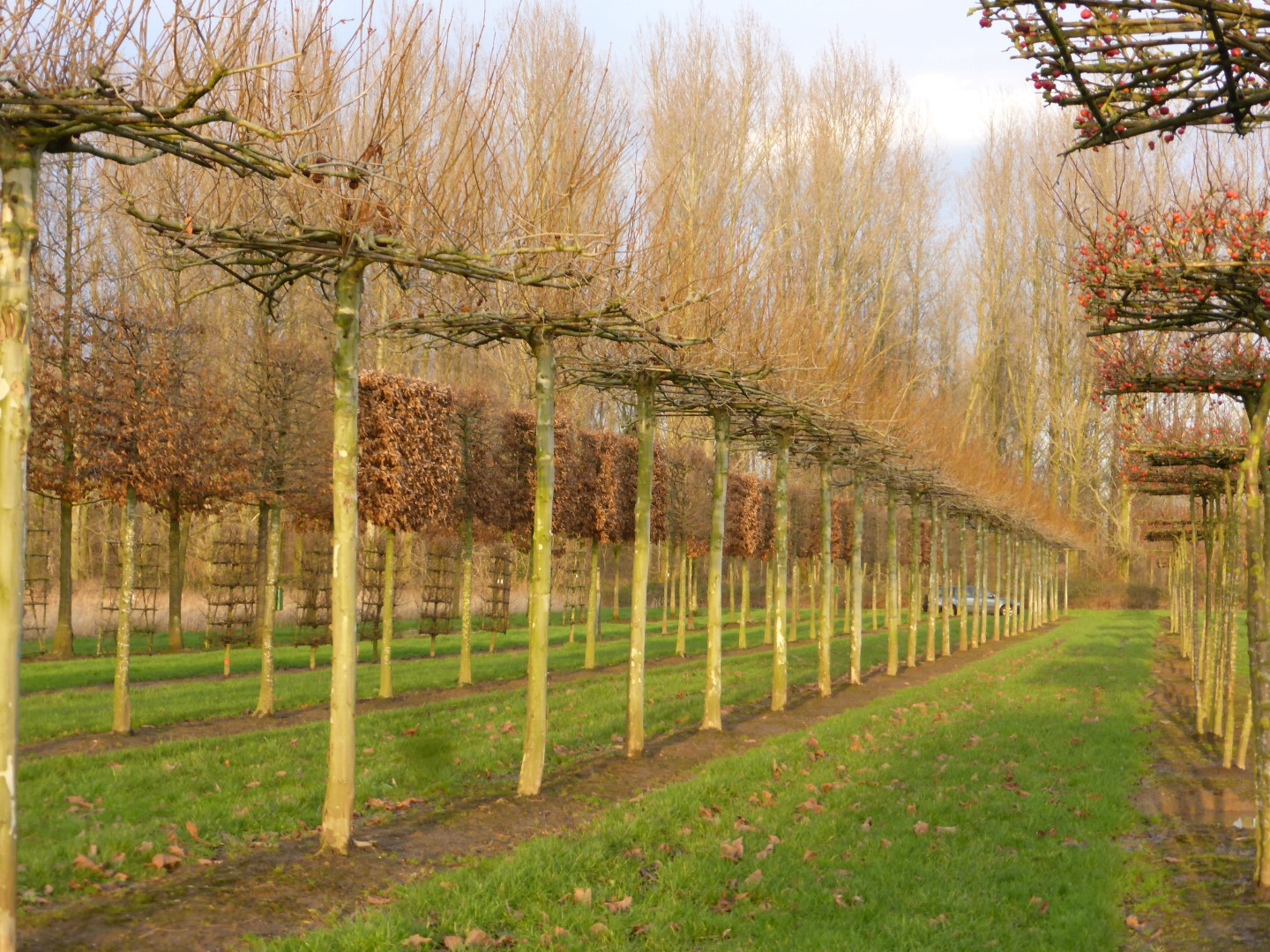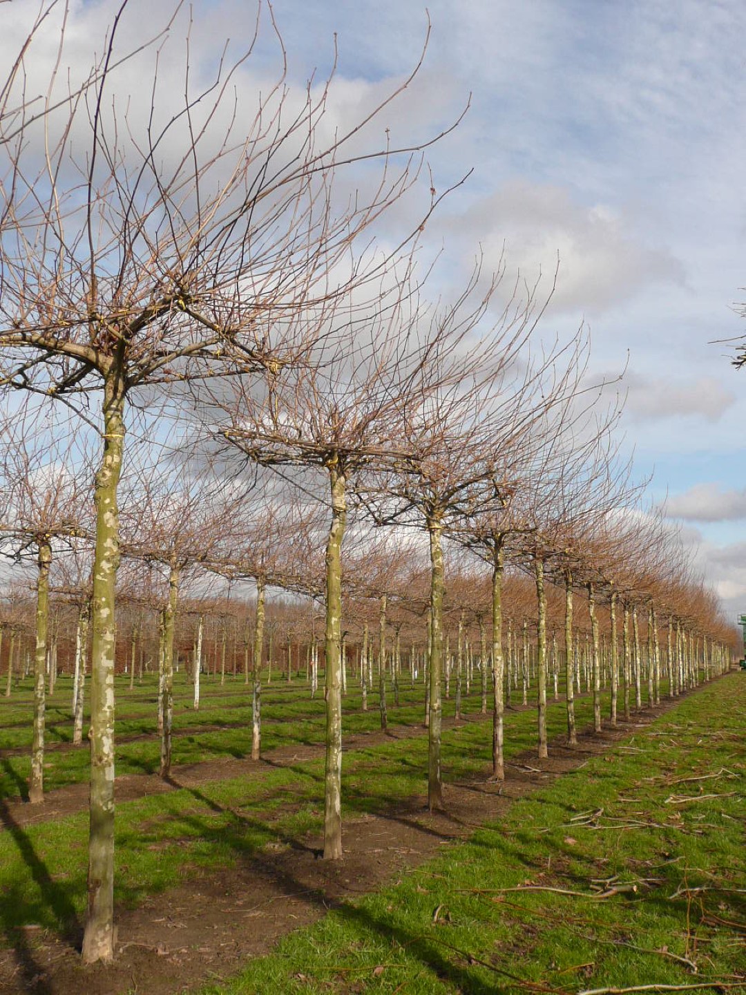 A tree selected by the NAKB (now known as Naktuinbouw) from a 40-year-old avenue. It is distinguished from the species by its relatively small oval growth pattern. It is characterised by the bark that flakes off to reveal a light green to yellow-green underground and grey-green, dark green to brown loose flakes. The broad leaf has 3 - 5 sharply serrated lobes and is slightly hairy on the underside. In the autumn the leaves turn colour to a brownish yellow. Fallen leaves do not rot easily. The spherical flowers hang in pairs (1 - 3) on long stems, where spiky fruit appears later. These remain hanging on the tree until deep into the winter. Plane trees are very resistant to hard surfaces but surface roots can push the surrounding paving upwards. Takes pruning very well, even in old wood. Saplings require a tree stake for support. Young branches break relatively easily.