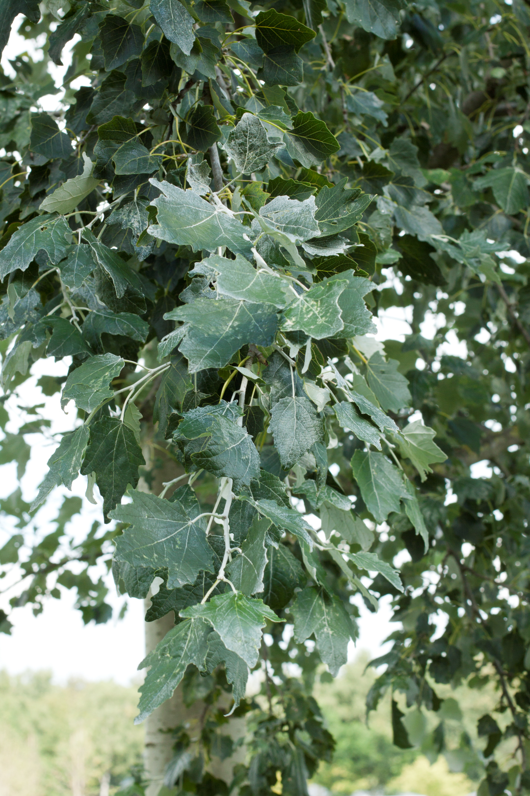 A cross between P. alba and P. alba 'Pyramidalis', forming a broad pyramidal crown with a straight trunk. The branches hang down somewhat when the tree ages. Growth is rapid in the early years but slows down later. The bark is dark grey-green and becomes rough at an early age. Adult specimens attain a height of 15 - 20 m. The palmate lobed leaves are dark green with white felt-like hairs on the underside. When the leaves first emerge they are light green with grey hairs. The autumn colour is yellow. The tree produces flowers in the form of female catkins. Used in urban areas as solitary and street tree, but is also planted in landscapes. Shows little sensitivity to wind and can take dry conditions. The tree prefers a loamy, moist and humic soil. Very sensitive to bacterial canker but less sensitive to leaf spot disease.