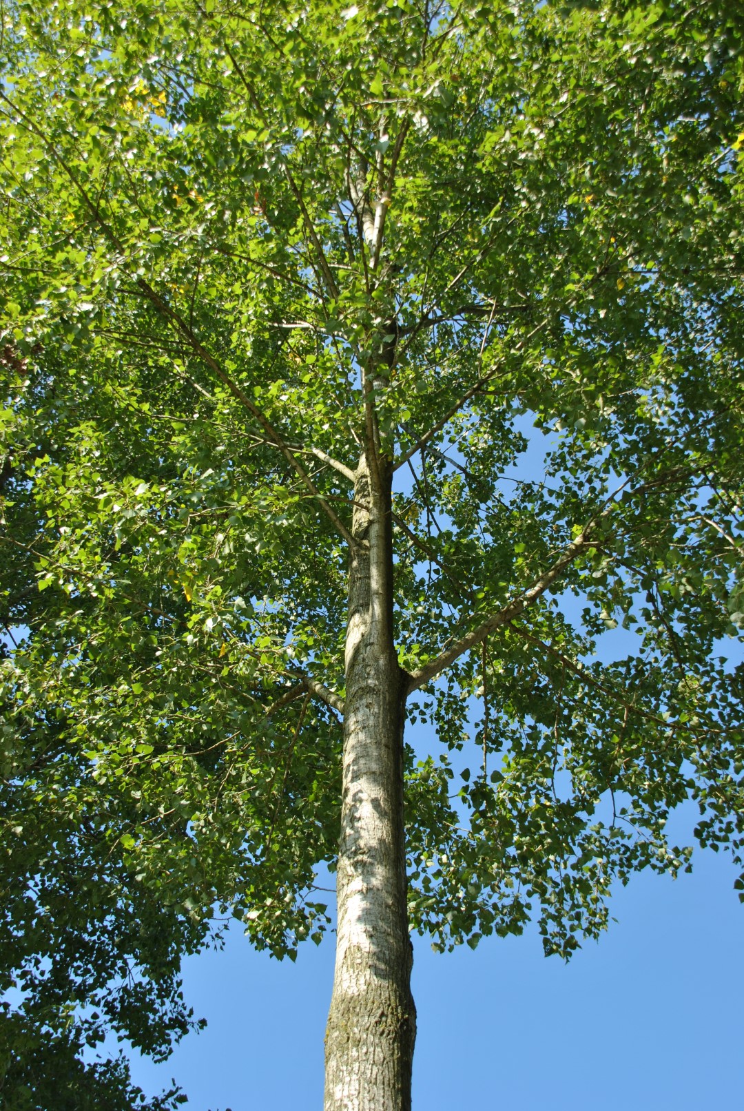 The young tree is still narrow and vertical but later a moderately broad spherical crown forms. The straight trunk has regular branching with steeply rising branches The tree can reach a height of 30 - 35 m. The bark is grey-white and thin, roughly grooved at the foot of the trunk. The triangular to diamond-shaped leaves have a straight foot. The leaves emerge early and are brownish-red in colour. In the summer they are green and turn yellowish-green in the autumn. The tree produces flowers in the form of male catkins. Very sensitive to rust but little sensitive to leaf spot disease and canker. Suitable for coastal areas because of its good resistance to wind. In addition the tree is also used for planting in urban and landscape settings. 'Robusta' prefers fertile, loamy and moist soils, is sensitive to dry conditions and frost and is a good producer of wood. Populus x canadensis 'Robusta' has a straight trunk with an ascending main branch. The foot of the trunk is grooved but the bark remains smooth higher up the tree.