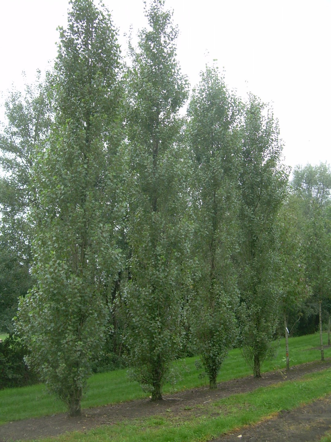 Forms a narrow columnar crown that later broadens out especially on the underside. Has a straight trunk and steeply ascending branches. The trunk has many tubercles. The green leaves are diamond-shaped to broad triangular. The emerge brownish-green, are an even colour of green in the summer and yellowish-green in the autumn. The tree produces flowers in the form of male catkins. 'Italica' is suitable for wind breaks, parks and public gardens and as a solitary in urban areas. It has many problems with broken branches and crown and is thus unsuitable as an avenue and street tree. The tree is little sensitive to bacterial canker, moderately sensitive to rust and very sensitive to leaf spot disease. Prefers nutritious moist soils and is somewhat sensitive to dry conditions. 'Italica' resists (sea) wind but is sensitive to late winter frost. Despite the fact that it is a relatively narrow tree, Populus nigra 'Italica' requires plenty of room, both above and below ground. The tree is extensively used in windbreaks.
