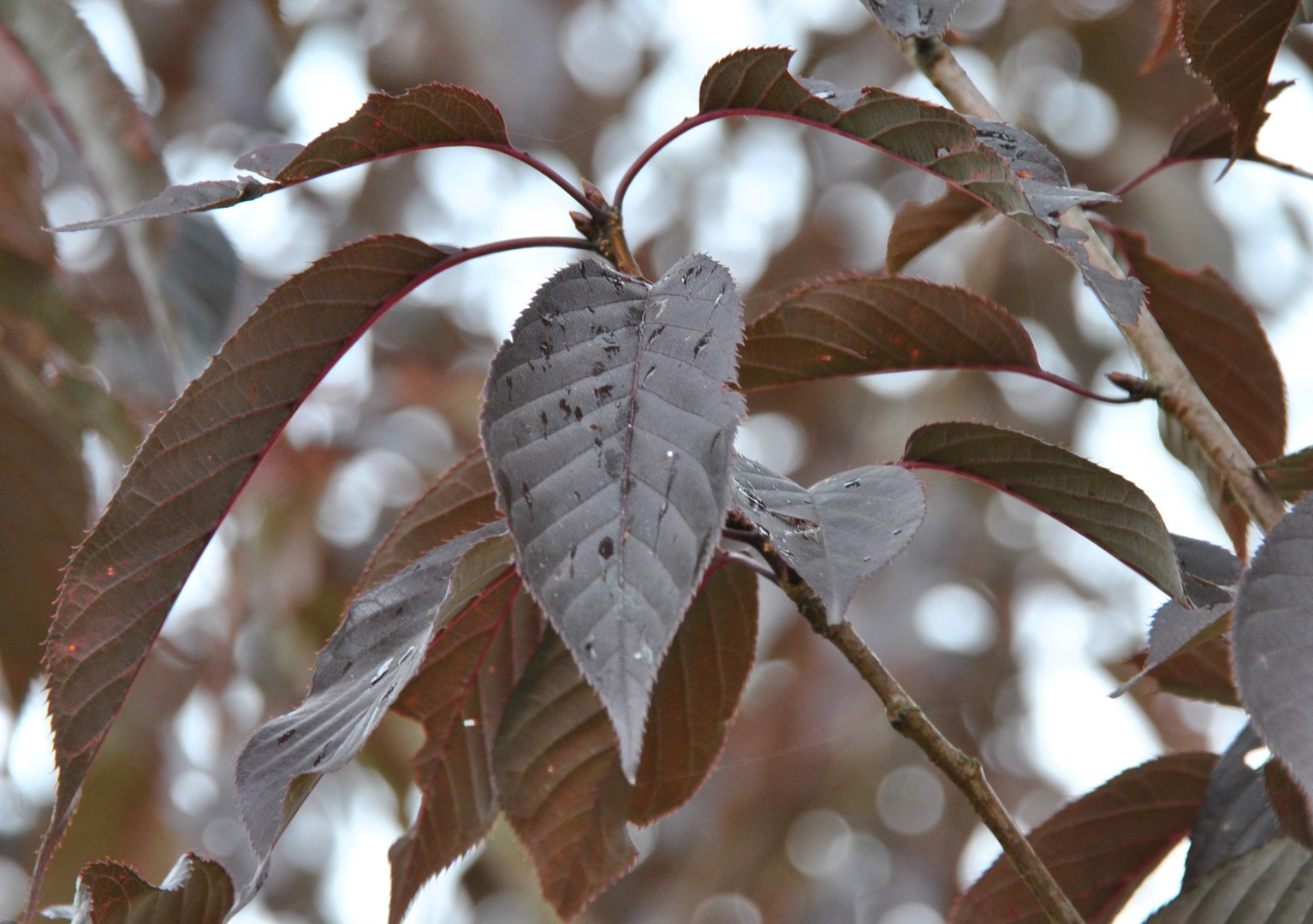 The leaves of Prunus serrulata 'Royal Burgundy' turn orange, red in autumn.