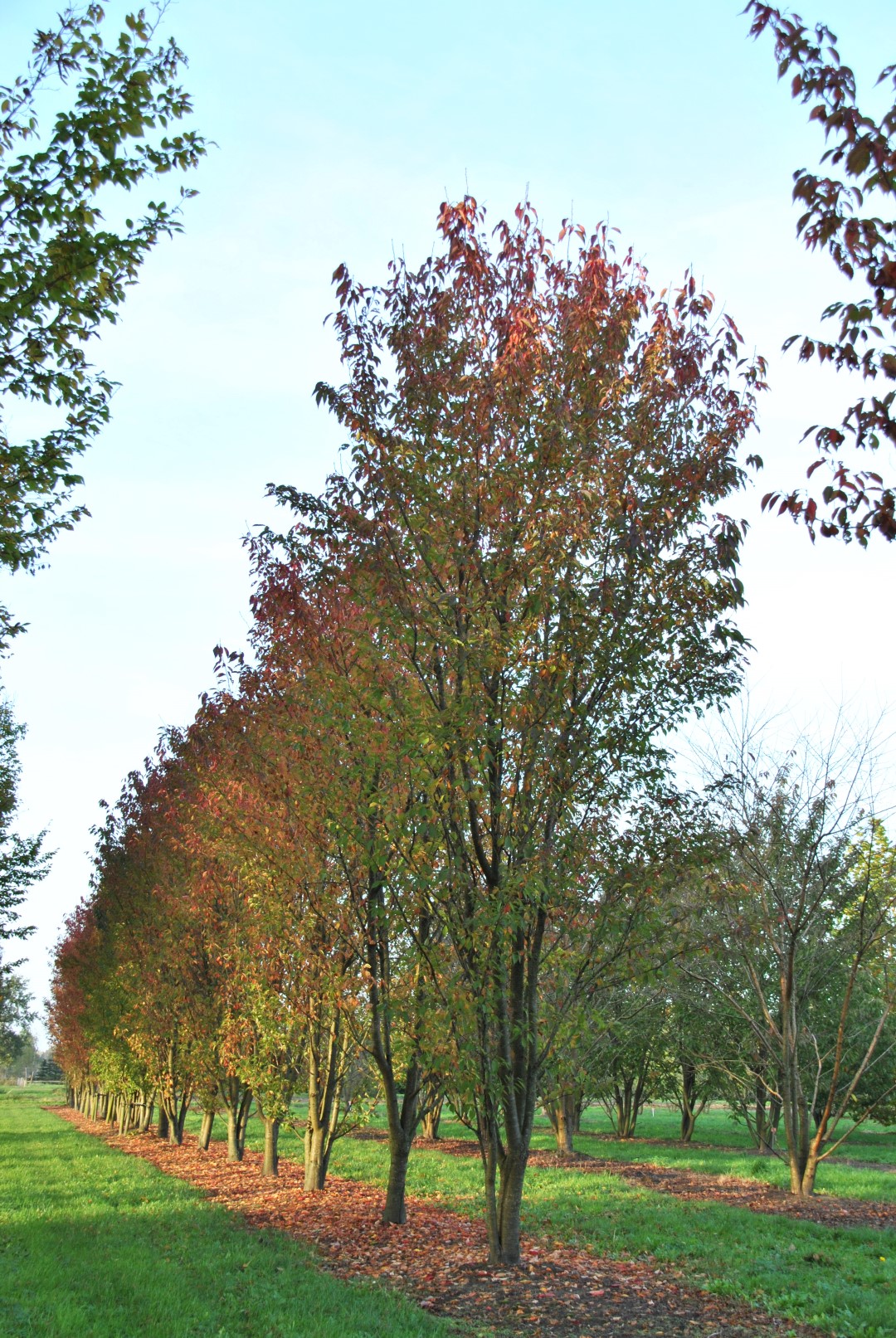 The leaves of Prunus serrulata 'Sunset Boulevard' turn red, purple in autumn.